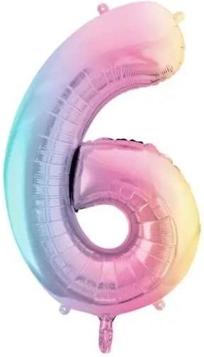Balon foliowy Cyfra "6" w kolorze pastelowym tęczowym , rozmiar przed napompowaniem ok. 100 cm (39"), rozmiar po napompowaniu ok. 86 cm (34"). Do napompowania powietrzem i helem. Zestaw zawiera słomkę. Wydawnictwo: PartyDeco