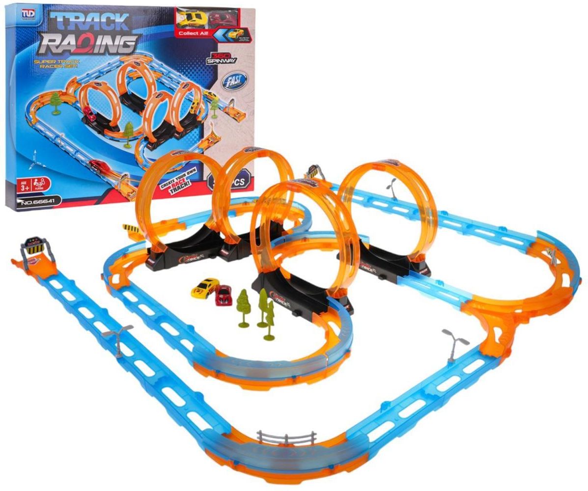 Opis Duży Tor Wyścigowy 59el. Podwójny tor wyścigowy z pętlami 360 stopni, dla dzieci od 3-go roku życia. Tor wykonano z najlepszej jakości plastiku w żywych kolorach. Na zestaw składa się 59 elementów do samodzielnego montażu. Tor posiada odcinki proste do rozpędzenia pojazdu, 4 pętlę 360 stopni i dwa pojazdy. Pojazdy napędzane są napędem pull back. Wystarczy delikatnie nacisnąć pojazd do tyłu, by przejechał tor z pełną mocą Funkcje toru odpowiedni dla dzieci od 3-go roku życia, wykonany z najlepszej jakości plastiku w żywych kolorach, 4 pętle 360 stopni, możliwość zabawy jednocześnie dwóch osób, pojazdy z napędem pull back. Wymiary zestaw po złożeniu ok. 90 cm x 82 cm x 23 cm, autko ok. 7 cm x 2,5 cm x 3,5 cm, drzewko ok. 7 cm x 3 cm, opakowanie ok. 54 cm x 41,5 cm x 7 cm. Zawartość zestawu części konstrukcyjne toru 59 elementów, 2 x pojazd, naklejki dekoracyjne, drzewka.