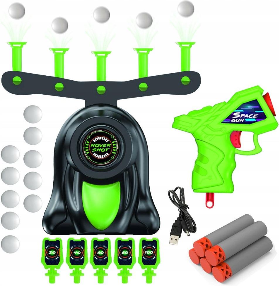 DARK SHOT - ZESTAW DO STRZELANIA Z LEWITUJĄCYMI KULKAMI Świeci w ciemności! Sprawdź swoją celność, strzelając do lewitujących kulek! Nowy wymiar rozgrywki - lewitujące cele to zupełnie nowy sposób na urozmaicenie zabawy. Piankowe cele unoszą się dzięki podmuchowi powietrza, delikatnie pływając nad urządzeniem. Strzelanie staje się dużo bardziej interesujące, jednocześnie trenując umiejętności strzeleckie i koordynację dziecka. Pływające cele to źródło niekończącej się zabawy, najlepszy prezent dla dzieci, dzieci mogą grać same lub z przyjaciółmi i rodziną, rozwija koordynację wzrokowo-ruchową u dzieci i trenuje celność, idealny prezent na urodziny i święta. Zawartość zestawu Podstawa powietrzna 5 kominów 5 składanych tarczy Pistolet na amunicję piankową 10 sztuk lewitujących piłeczek 5 sztuk amunicji piankowej przewód zasilający USB Pistolet z dalekim zasięgiem Poręczny, jednostrzałowy pistolet sprężynowy zapewnia świetne rozpoczęcie zabawy! Jeden z najmniejszych pistoletów. Niech Cię jednak nie zmylą kompaktowe wymiary - jego moc i siła jest ogromna! Zasięg do 10-12 metrów pozwala na nieograniczoną zabawę. Instrukcja: Załaduj pistole pociągając za uchwyt umieszczony na spodzie rączki pistoletu Umieść piankową strzałkę w lufie Wymierz wyrzutnią w kierunku latających kulek i pociągnij za spust! Unoszące się piłeczki mogą być używane z innymi broniami piankowymi typu NERF! Zobacz inne nasze aukcje. Tryb składanych tarczy Dołączone do zestawu fluorescencyjne tarcze pozwalają na zabawę nawet po zmroku, dostarczając nowych wrażeń z zabawy. Urządzenie w tym trybie nie potrzebuje zasilania, by urozmaicić rozgrywkę. Regulacja mocy strumienia powietrza Ty decydujesz która piłeczka ma być wyżej, a która niżej. Prosty system regulacji przepływu powietrza pozwala w łatwy sposób dostosować zabawkę do swoich preferencji. Dwa tryby zasilaniaZasilanie poprzez przewód USB lub 4 baterie AAPrzewód dołączony do zestawu można podłączyć do każdego portu USB z zasilaniem np. standardowej ładowarki do telefonu, powerbanka, czy też komputera.Wystarczą 4 baterie AA (brak w zestawie), by świetnie się bawić, bez martwienia się o zewnętrzne zasilanieUwaga! Nie używaj zasilania USB gdy w zabawce znajdują się baterie. Grozi to uszkodzeniem zarówno baterii jak i urządzenia.