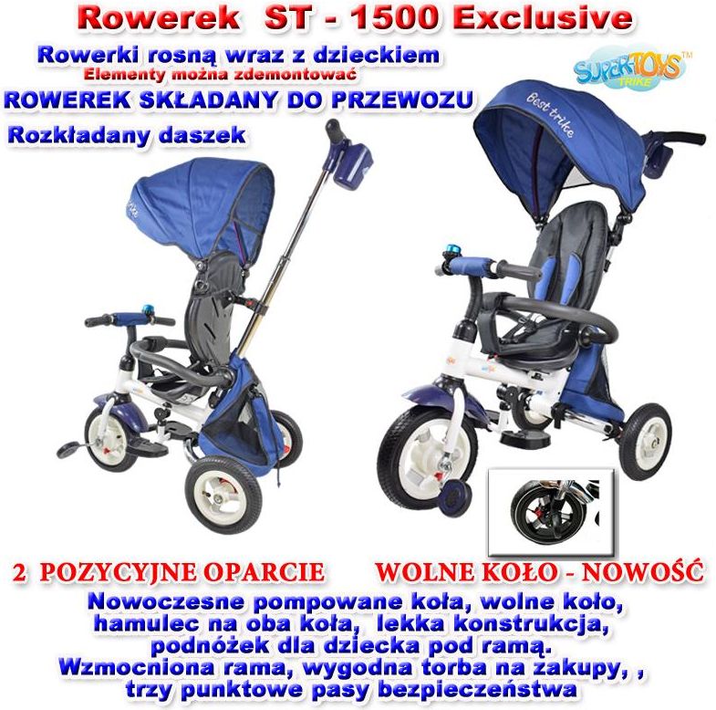 NAJBARDZIEJ OCZEKIWANY PRODUKT TEGO SEZONUST-1500 - FREE WHEEL EXCLUSIVE Z ŁATWĄ MOŻLIWOŚCIĄ ZŁOŻENIA I HAMULCEM NA OBA KOŁA Wersja z składanymi podnóżkami i regulacją nachylenia oparcia. Nowością w tym modelu jest nowy rodzaj rączki, tylna duża torba i składana wzmacniana rama. Rowerek na pompowanych kołach - które dają pełen komfort jazdy Mamy przyjemność zaprezentować najnowszą serię oryginalnych rowerków trójkołowych: "SUPER-TOYS TRIKE" Wersja rowerków z najbogatszym pełnym wyposażeniem. Najnowsza seria z wolnym kołem przednim i regulowanym oparciem. Do każdego pojazdu proponujemy tablicę rejestracyjną - proszę kliknąć na animację w celu przejścia do produktu. Jest to dodatkowe uatrakcyjnienie pojazdu. Tablica jest dokładana do tej samej paczki w której znajduje się pojazd. Tylko u nas. Tylko z tym znakiem: Wyjątkowy styl i jakość rowerków to bez wątpienia atuty klasyfikujące je na pierwszej pozycji w Polsce. Najnowsze modele z pełnym wyposażeniem dostępnym tylko u nas. Nasze długoletnie doświadczenia pozwalają nam sprzedawać rowerki w najlepszych wersjach i optymalnych konfiguracjach, które zapewnią pełen komfort jazdy. Rowerek rośnie wraz z dzieckiem, wszystkie elementy można dowolne zdejmować i konfigurować tak, aby odpowiadały dziecku. Dodatkowym atutem jest dostępna tylko u nas interaktywna instrukcja montażu, która krok po kroku przeprowadzi Was przez montaż rowerka. Kupujcie tylko najlepsze rowerki gwarancja jakości. Od prawie 20 lat bawimy Wasze dzieci. Nasz model posiada najbogatsze wyposażenie. Kolor niebieski: Kolor purpurowy:Opis funkcji rowerka:Miękkie wyściełanie siedzenia - specjalna wkładka,3 punktowe pasy bezpieczeństwa, miękka barierka zabezpieczająca,sprawiają że dziecko ma najwyższy komfort jazdy.Animacja regulowania oparcia:Animacja regulowania podnóżka: Regulowany daszek chroniący przed słońcem, z okienkiem - możliwość rozpięcia daszka i całkowitego zakrycia dostępu słońca do dziecka.Dodatkowym atutem jest małe okienko w daszku oraz część rozpinana daszku Daszek oczywiście można w każdej chwili zdemontować przy pomocy przycisku. Opis modelu: z tyłu regulowany drążek połączony z kierownicą za pomocą cięgna sterującego, którym można w każdej chwili skorygować manewry dziecka, wysokość drążka można regulować w zakresie od 84 cm do 105 cm, dodatkowym atutem tego modelu jest nowa super wygodna rączka z zdejmowanym uchwytem na kubek rowerek posiada tzw. wolne koło przednie - pedały nie kręcą się gdy dziecko jest pchane przez Rodzica regulowane siedzenie - a każdej chwili oparcie można pochylić, gdy dziecko będzie zmęczone siedzeniem, dla początkujących składany podnóżek dla niemowlaków pod stopy, stabilne, szerokie koła pompowane umożliwiające cichą i komfortową jazdę, regulowany daszek ochronny przed słońcem - jest rozkładany lub można go złożyć, specjalna torba na zakupy z tyłu rowerka idealnie nadaje się również jako torba z którą możemy wejść do sklepu, aby zdjąć ją z rowerka wystarczy ją zdjąć z uchwytów które posiadają rzepy rozkręcaną, miękką poręcz zabezpieczającą dziecko przed upadkiem, która rozpina się bardzo lekko aby wyjąć dziecko z rowerka. trzypunktowe pasy bezpieczeństwa, miękkie wyściełanie siedzenia jedną z najważniejszych cech tego modelu jest MOŻLIWOŚĆ ŁATWEGO DEMONTAŻU - ZA POMOCĄ 1 PRZYCISKU SKŁADAMY ROWER I WKŁADAMY DO SAMOCHODU - oraz możliwość regulacji wysokości drążka kierującego obracany dzwonek, ściągany pokrowiec na siedzenie, antypoślizgowe manetki, antypoślizgowe pedały hamulce na oba koła WYMIARY ROWERKA: długość z rączką: ok. 105 cm, szerokość: ok. 50 cm, wysokość kierownicy: ok. 57 cm, wysokość drążka do prowadzenia ok : od 95 do 101 cm, wysokość daszka: ok. 105 cm, wysokość oparcia - od siedzenia: ok. 40 cm, średnica koła przedniego: ok. 26 cm, średnica koła tylnego ok. : 22 cm szerokość koła przedniego: 5,5 cm, szerokość kół tylnych: 4,5 cm, odległość od krawędzi siedzenia do pedałów: ok. 40 cm, odległość od oparcia do pedałów: ok 68 cm waga: ok.9 kg, max obciążenie: ok. 25 kg. Do każdego rowerka pisemna gwarancja na 12 miesięcy. Wymiar tablic rejestracyjnych 8cm x 3cm Paragon fiskalny ( lub FV), Instrukcja obsługi w języku polskim oraz dostęp do instrukcji interaktywnej. Zapewniamy serwis gwarancyjny i pogwarancyjny rowerków Wszystkie nasze zabawki posiadają certyfikat CE - czyli są w pełni bezpieczne. Uwaga: Nie należy pompować kół kompresorem, należy to zrobić najlepiej zwykłą pompką rowerową. Zalecane ciśnienie w oponie 2.5 BARA Montaż rowerka - film instruktażowy: Ostrzeżenia: 1. Montaż musi być wykonany przez osobę dorosłą. 2. Jazda zawsze musi odbywać się pod nadzorem osoby dorosłej, nie należy jeździć po drogach publicznych ( w ruchu publicznym) w pobliżu miejsc niebezpiecznych, może to skutkować wypadkiem. 3. Należy stosować wyposażenie ochronne typu kask, ochraniacze na kolana, ochraniacze na łokcie. 4. Przeznaczenie od: 1 do 5 lat.
