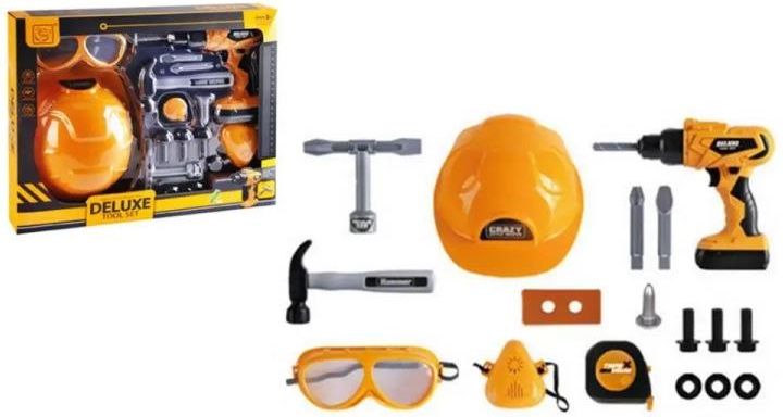 Zestaw narzędzi do zabawy w majsterkowicza. W zestawie m.in. kask, okulary ochronne, wiertarka, młotek i inne akcesoria. Wybrane elementy zestawu działają na baterie typu AA. Baterie nie są załączone do zabawki.