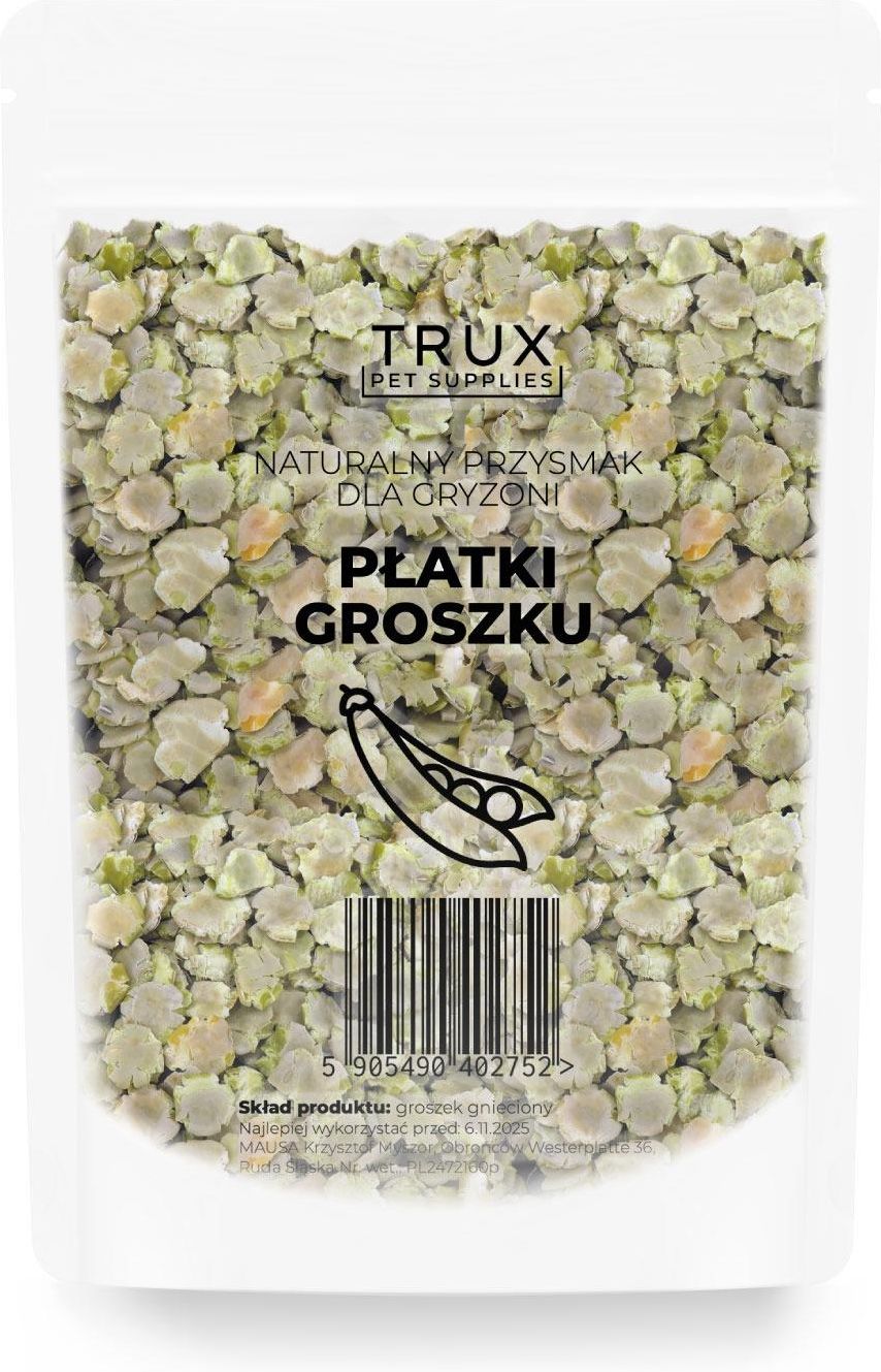 TRUX Naturalny Przysmak Dla Gryzoni - Płatki Grochu 100g TRUX Naturalny Przysmak Dla Gryzoni - Płatki Grochu 100g to idealny wybór dla właścicieli gryzoni, którzy cenią zdrowe i naturalne przekąski dla swoich pupili. Płatki grochu powstają w wyniku delikatnego procesu gniecenia, który pozwala zachować ich naturalne wartości odżywcze. To doskonałe uzupełnienie codziennej diety gryzoni, takich jak chomiki, świnki morskie, króliki czy myszy. 100% naturalny skład – bez sztucznych dodatków, barwników i konserwantów. Bogaty w białko roślinne – wspiera zdrowy rozwój i kondycję gryzoni. Pomaga w ścieraniu zębów – krucha konsystencja wspomaga higienę jamy ustnej. Łagodny proces gniecenia – zachowanie pełni wartości odżywczych. Produkt jest bogaty w białko roślinne, które wspiera rozwój i utrzymanie dobrej kondycji zwierząt. Zawarty w płatkach błonnik wspomaga prawidłowe funkcjonowanie układu trawiennego, dbając o zdrowie pupila. Dzięki naturalnemu składowi bez dodatku sztucznych substancji masz pewność, że podajesz swojemu zwierzakowi to, co najlepsze. Płatki grochu od TRUX charakteryzują się łagodnym smakiem i kruchą konsystencją, która zachęca gryzonie do gryzienia. Taka forma przekąski wspiera również naturalne ścieranie zębów, co jest niezwykle ważne w profilaktyce zdrowia jamy ustnej. To nie tylko smakołyk, ale i sposób na wspieranie zdrowia Twojego pupila. Zaufaj jakości TRUX i wybierz Naturalny Przysmak Dla Gryzoni - Płatki Grochu 100g jako zdrową i smakowitą przekąskę, która dostarczy Twojemu pupilowi radości i wartości odżywczych każdego dnia! Zapakowane w wygodne opakowanie z zamknięciem strunowym (doypack). Produkty marki TRUX są synonimem wysokiej jakości i dbałości o detale. W każdym aspekcie produkcji wykorzystywane są wyłącznie najwyższej klasy ziarna, które są starannie selekcjonowane, aby zapewnić zwierzętom najwyższą wartość odżywczą. W procesie produkcji TRUX starannie wybiera dostawców oraz stawia na kontrolę jakości na każdym etapie od zbioru po pakowanie. Skład produktu groch 100%