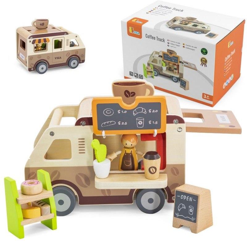 Viga 44689 Drewniana mobilna kawiarenkaDrewniana mobilna kawiarenka Viga 44689 to niezwykle kreatywna i starannie wykonana zabawka, która przenosi dzieci w fascynujący świat kawiarnianych przygód. Dzięki realistycznym elementom, maluchy mogą wcielać się w rolę baristy i obsługiwać swoich klientów, co sprawia, że zabawa staje się niezwykle wciągająca. Kawiarenka nie tylko dostarcza rozrywki, ale także wspiera rozwój dziecka na wielu płaszczyznach, rozwijając jego wyobraźnię, zdolności motoryczne i umiejętności społeczne.Mobilna kawiarenka od Viga to świetny sposób na wprowadzenie dzieci w świat codziennych czynności, które widzą na co dzień u dorosłych. Zabawa w przygotowywanie kawy i serwowanie posiłków rozwija empatię i zdolności komunikacyjne, ucząc maluchy interakcji w różnych sytuacjach. Solidna, drewniana konstrukcja oraz starannie dobrane w pastelowej kolorystyce, nietoksyczne farby sprawiają, że zabawka jest nie tylko estetyczna, ale także bezpieczna dla najmłodszych. Zestaw został zaprojektowany z myślą o rozwoju wyobraźni, zdolności manualnych i umiejętności społecznych dzieci, oferując jednocześnie wielogodzinną, twórczą zabawę. Idealny dla maluchów, które kochają przygody i marzą o własnym mobilnej kawiarni na kółkach!W zestawie:- Figurka baristy idealna do odgrywania roli profesjonalnego sprzedawcy kawy, - Półeczka na wypieki umożliwia prezentowanie pysznych przekąsek, - Donut, croissant i chleb realistyczne elementy, które dzieci mogą "sprzedawać" klientom, - Kubek z kawą podstawowy element każdej kawiarenki, - Roślina dekoracyjna zapewni estetyczny wygląd kawiarenki, - Tablica reklamowa z menu umożliwia dzieciom wycenę produktów, - Ekspres do kawy i stół realistyczne akcesoria do przygotowywania napojów, - Tablica informacyjna z funkcją otwierania z informacją, czy kawiarenka jest "otwarta" czy "zamknięta", Kamper wykonany z drewna, wykończony w przyjaznych kolorach, jest idealnymnarzędziem do rozwijania wyobraźni i umiejętności społecznych dzieci , co zapewnia realistyczne doznania podczas odgrywania ról. Zalety produktu: Wielofunkcyjność – zestaw obejmuje liczne akcesoria (figurka baristy, ekspres do kawy, ciastka itp.), które zapewniają różnorodne możliwości zabawy i angażują dziecko na długie godziny. Rozwój kreatywności i wyobraźni – dzieci mogą tworzyć własne scenariusze zabawy, co sprzyja rozwijaniu wyobraźni oraz twórczego myślenia. Zabawa w odgrywanie ról – kawiarenka pozwala na naukę poprzez zabawę, ucząc dzieci umiejętności społecznych, takich jak obsługa klienta, a także nawiązywania i utrzymywania relacji. Rozwój umiejętności społecznych – doskonała okazja do wspólnej zabawy z rodzeństwem czy przyjaciółmi, co sprzyja nauce współpracy i dzielenia się. Wspieranie zdolności manualnych – zabawa z ruchomymi elementami, ustawienie ciasteczek na półce czy innym akcesoriom, rozwija precyzję ruchów dłoni i koordynację ręka-oko. Rozwój umiejętności motorycznych – maluchy manipulując drobnymi elementami, takimi jak kubeczki, ciasteczka i figurki, poprawiają swoją koordynację ruchową oraz zdolności manualne. Nauka wartości pieniądza – dzięki dołączonej tablicy z cenami, dzieci mogą uczyć się podstaw matematyki i zarządzania "sprzedażą" poprzez zabawę.Bezpieczna zabawa – Zabawka wykonana jest z wysokiej jakości drewna i wykończona nietoksycznymi farbami, co zapewnia bezpieczeństwo podczas zabawy. Korzyści dla Dziecka:-Poprawa zdolności manualnych podczas układania elementów i manipulowania akcesoriami, - Rozwój wyobraźni dzięki odgrywaniu różnych scenariuszy związanych z podróżami i wakacjami, - Wspieranie interakcji społecznych, gdy dziecko bawi się wspólnie z rodzeństwem lub przyjaciółmi, rozwijając przy tym umiejętności komunikacyjne, - Nauka podstawowych pojęć związanych z podróżami, odpoczynkiem i rekreacją, w przyjazny i angażujący sposób. Jak korzystać z produktu:Dzieci mogą tworzyć różnorodne scenariusze związane z prowadzeniem kawiarni, przygotowywaniem kawy i wypieków, co stymuluje ich wyobraźnię. Mogą wcielać się w rolę baristy, klientów lub nawet dekoratora kawiarni, co sprzyja twórczemu myśleniu. Dzięki odgrywaniu ról dzieci uczą się podstawowych umiejętności społecznych, takich jak obsługa klienta, prowadzenie rozmowy czy współpraca z innymi. Zabawa w kawiarenkę pozwala im lepiej zrozumieć codzienne sytuacje, które widzą u dorosłych. Kawiarenka zachęca do wspólnej zabawy, co sprzyja nauce dzielenia się, współpracy i wzmacniania więzi z rówieśnikami. Dzieci mogą bawić się w grupie, co uczy je empatii i współpracy. Własna "kawiarenka" to szansa na naukę samodzielnego podejmowania decyzji. Dzieci muszą same zarządzać zamówieniami, obsługiwać klientów i organizować przestrzeń, co wzmacnia poczucie odpowiedzialności.Dzięki tablicy z cenami, dzieci mogą uczyć się podstaw liczenia i wartości pieniądza, co wprowadza je w świat podstawowej matematyki poprzez zabawę. Dzięki tym wszystkim korzyściom, drewniana kawiarenka mobilna Viga 44689 jest nie tylko świetną zabawką, ale także narzędziem wspierającym rozwój dziecka w wielu kluczowych obszarach. Elementy zabawki zostały zapakowane w estetyczny, kolorowe pudełko, dzięki temu estetycznemu opakowaniu zabawka jest idealna na prezent! Całość wykonana została z drewna bukowego i pomalowana farbami, które zadowolą każdego użytkownika i dadzą mnóstwo radości z zabawy. Naszym priorytetem jest bezpieczeństwo i jakość oferowanych produktów, dlatego dbamy o to aby farby, którymi malujemy nasze zabawki spełniały normy bezpieczeństwa ( EN71 i ASTM). Zabawka przeznaczona dla dzieci powyżej 3 roku życia. Wymiary produktu:Dł.190 mm x wys. 150 mm x szer. 118 mm Wymiary opakowania:Dł.23 mm x wys. 150 mm x szer. 150 mm Waga netto: 