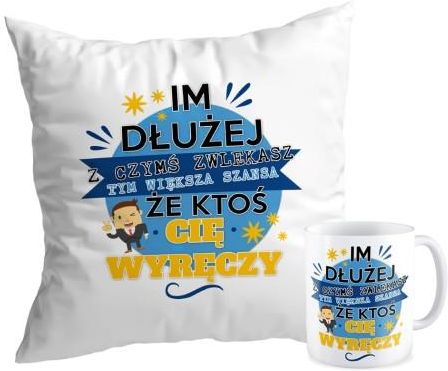Zestaw składający się z kubka i poduszki to świetny pomysł na prezent. Poranna kawka w takim kubku będzie nieziemsko smakować, a poduszka pozwoli na chwilę relaksu w wolnym czasie. Zabawny tekst i niebanalny projekt z pewnością sprawi wiele radości ;) PODUSZKA Tylko u nas w tak atrakcyjnej cenie otrzymujesz poduszkę ze zdejmowaną poszewką. Dzięki takiemu rozwiązaniu poszewkę możesz w każdej chwili wyprać, nie narażając wkładu na utratę swych właściwości elastycznych. Każda poduszka pakowana w woreczek foliowy. Opis produktu: ROZMIAR: 40cm x 40cm (+/- 2cm) POSZEWKA: materiał: mikrofibra gramatura: 90 wyposażona w zamek błyskawiczny WKŁAD: 100% włókno silikonowe 1 gatunek antyalergiczny NADRUK: pełnokolorowy, niewyczuwalny w dotyku, żywe kolory KUBEK Opis produktu: Powłoka: wielowarstwowa utwardzana De Lux Pojemność: 330ml Wysokość: 93mm Nadruk: pełnokolorowy, niewyczuwalny w dotyku Rozmiar nadruku: max. 190mm - 93mm Nadruk odporny na mycie w zmywarce