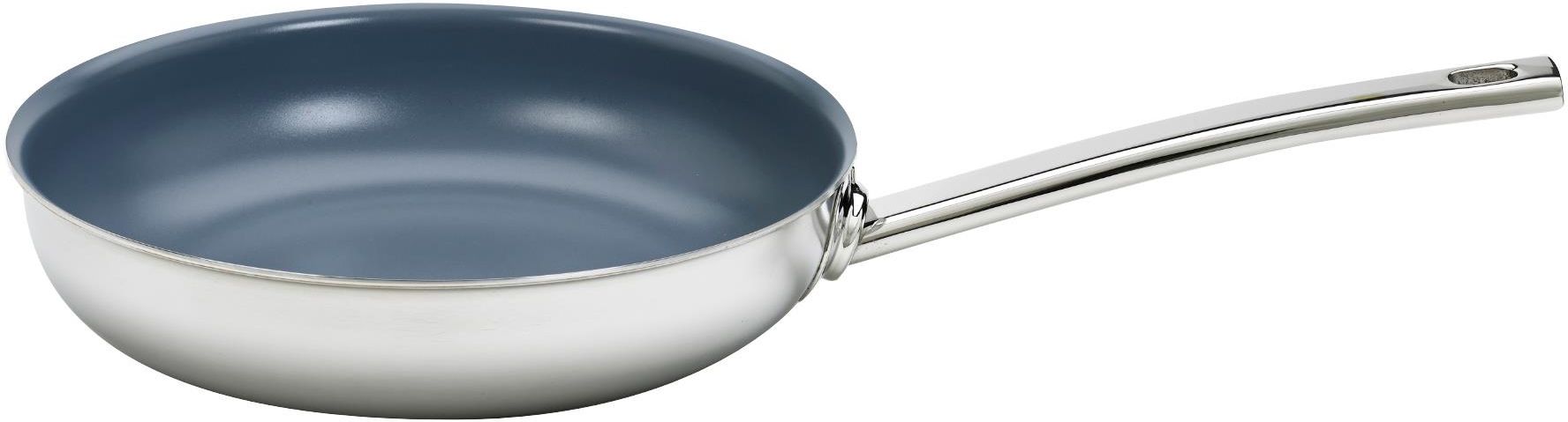 Płaska patelnia o średnicy 24 cm marki Demeyere z linii Ecoline 5 pokryta powłoką nieprzywierającą Ceraforce Ultra. Posiada ergonomiczny, stalowy uchwyt.