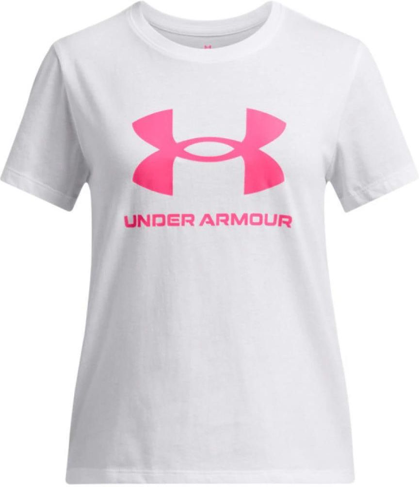 T-shirt dziewczęcy - styl i wygoda na co dzień Koszulka doskonale się sprawdzi w różnorodnych stylizacjach na co dzień, jak również jako element sportowej stylizacji. Koszulka Under Armour model: 1389756 w kolorze białym posiada luźny fason (loose), który swobodnie układa się na sylwetce, aby zapewnić komfortowe użytkowanie oraz pełny zakres ruchów. Dziewczęcy t-shirt z nadrukiem posiada standardową długość, sięgającą do bioder. Koszulka z nadrukiem dziewczęca jest wykonana w 60% z bawełny, dzięki czemu jest wytrzymała, miękka i przyjemna w dotyku. Dzięki dodatkowi poliestru (40%) materiał utrzymuje fason i posiada zwiększoną trwałość. T-shirt Under Armour dla dziewcząt z wyrazistym nadrukiem Okrągły dekolt wykończony ściągaczem. Z przodu koszulki umieszczony został nadruk Under Armour w neonowym kolorze. Biała koszulka z krótkim rękawem dla dziewczyny UA Big Logo SS - szczegółowe cechy: obszerny krój loose dla zapewnienia komfortu podczas aktywności oraz pełnego zakresu ruchu standardowy fason o długości do bioder wykonana w 60% z bawełny, dzięki czemu jest wytrzymała, miękka i przyjemna w dotyku dodatek poliestru (40%) sprawia, że materiał jest wytrzymały i lepiej utrzymuje fason okrągły dekolt wykończony ściągaczem z przodu nadruk Under Armour