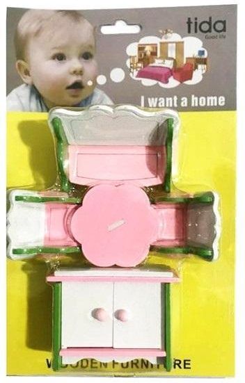 Drewniane mebelki dla lalek szafka, stolik z 2 fotelami i kanapą. Produkt zapakowany w kartonową podstawkę z przezroczystym kloszem.
