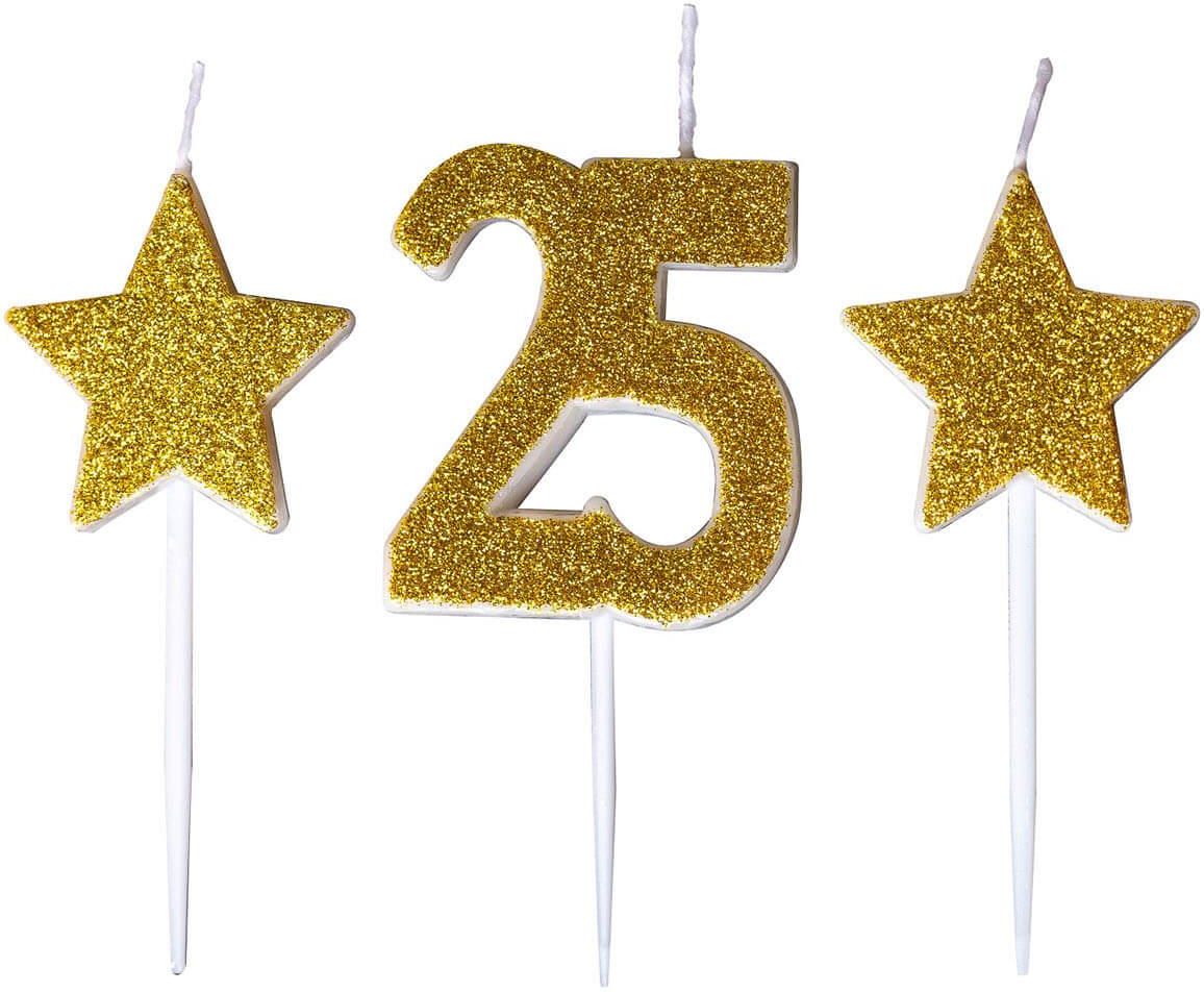 W zestawie: - świeczka liczba dwadzieścia pięć 25, - świeczki gwiazdki (2 szt.). Idealna dekoracja tortu na dwudzieste piąte urodziny. Opakowanie: 3 szt.
