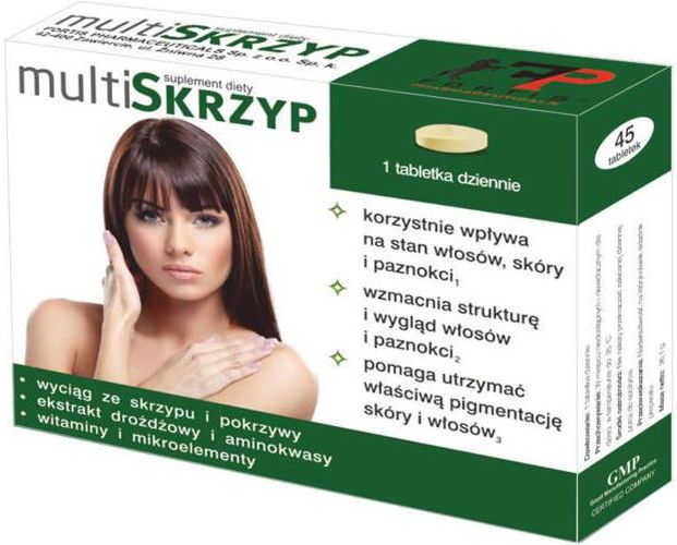 Suplement diety Suplement diety MultiSkrzyp to preparat zawierający kluczowe dla zdrowia włosów, skóry i paznokci witaminy, mikroelementy oraz aminokwasy połączone z wyciągami ze skrzypu i pokrzywy oraz ekstraktem drożdżowym. Składniki preparatu korzystnie wpływają na stan włosów, skóry i paznokci, wzmacniają strukturę i wygląd włosów i paznokci oraz pomagają utrzymać właściwą pigmentację skóry i włosów. Zastosowanie: uzupełnienie diety w składniki istotne dla zachowania prawidłowej kondycji i wyglądu skóry, włosów oraz paznokci. Zalecane spożycie: 1 tabletka dziennie. Składniki: celuloza mikrokrystaliczna (substancja wypełniająca), wodny wyciąg z ziela pokrzywy, wodny wyciąg z ziela skrzypu, wyciąg drożdżowy, L-metionina, kwas l-askorbinowy (witamina C), L-cysteina, sole magnezowe kwasów tłuszczowych - stearynian magnezu (substancja przeciwzbrylająca), niacyna (witamina B3), dwutlenek krzemu (substancja przeciwzbrylająca), glukonian miedzi, D-pantotenian wapnia, octan retinylu, ryboflawina, chlorowodorek pirydoksyny, chlorowodorek tiaminy, kwas pteroilomonoglutaminowy, D-biotyna. 1 tabletka zawiera: wyciąg z ziela skrzypu 100mg, wyciąg z ziela pokrzywy 100mg, , wyciąg drożdżowy 50mg, L-metionina 40mg, kwas l-askorbinowy (witamina C) 40mg (50%)*, L-cysteina 20mg, niacyna (witamina B3) 8mg (50%)*, witamina B5 3mg (50%)*, witamina B2 0,7mg (50%)*, witamina B6 0,7mg (50%)*, witamina B1 0,55mg (50%)*, miedź 0,5mg (50%)*, witamina A 400mcg (50%)*, kwas foliowy 100mcg (50%)*, biotyna 25mcg (50%)*. *RWS - Rereferncyjna wartość spożycia. Przeciwwskazania: nie należy stosować w przypadku nadwrażliwości na którykolwiek składnik preparatu. Ważne wskazówki: Nie przekraczać zalecanej porcji do spożycia w ciągu dnia. Produkt nie może być stosowany jako substytut zróżnicowanej diety i zdrowego trybu życia. Zrównoważony sposób żywienia prawidłowy tryb życia jest ważny dla funkcjonowania organizmu człowieka. Preparat należy przechowywać w suchym miejscu, w temperaturze do 25°C, w sposób niedostępny dla małych dzieci. Chronić przed wilgocią. Producent: Fortis Pharmaceuticals Sp. z o.o. Sp.k. Żniwna 28 42-400 Zawiercie