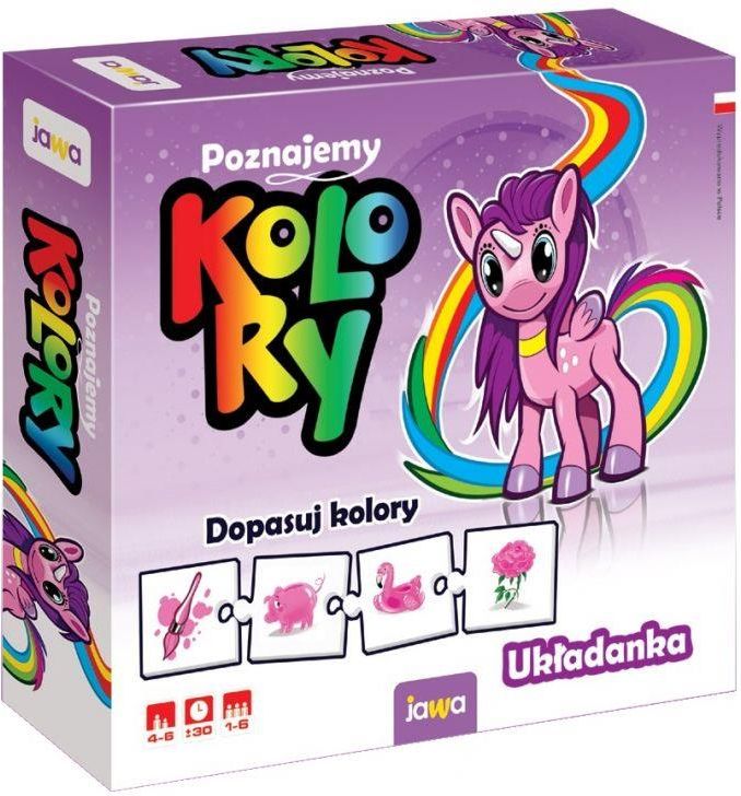 Poznajemy kolory - edukacyjna układanka JAWA Nasz otaczający świat jest nieskończonym kalejdoskopem barw. Poznajemy Kolory to edukacyjna układanka, która pomaga maluchom nauczyć się rozróżniania różnych kolorów. Gra jest nie tylko zabawą, ale również efektywnym narzędziem do nauki rozpoznawania barw przedmiotów, roślin, czy zwierząt.Zestaw składa się z 48 części do składania: każdy zestaw zawiera 12 różnych kolorów, które dzieci dobierają do siebie, tworząc ładne połączenia. Przegranym jest czarny kolor, a wygranym - wszystkie kolory tęczy. Jak mawiał kiedyś refren znanej piosenki: "Czarne przegrywa, kolor wygrywa, w kolory grajmy dziś". Zapraszamy więc do zabawy kolorami i nauki przez zabawę! EAN: 5901838002974