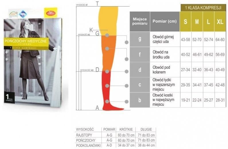 Na tej aukcji sprzedajemy pończochy o długości krótkiej z palcami zakrytymi. Rozmiar oraz kolor wybierz powyżej, klikając w odpowiednie kafelki. Pończochy uciskowe Pani Teresa Medica, 1 klasa kompresji ucisk 15-21 mmHg kryjące, nieprzezroczyste duży wybór kolorów antybakteryjna powłoka srebra Sanitized Jeśli męczą Cię takie nieprzyjemne dolegliwości jak: narastający w trakcie dnia obrzęk i ból nóg skurcze nocne, uczucie napięcia w nogach obecność drobnych popękanych żyłek - pajączków profilaktycznie, gdy dużo siedzimy i stoimy lub podróżujemy Efektem stosowania jest złagodzenie: pierwszych objawów niewydolności żylnej (np. pajączków), uczucia zmęczenia, bólu i napięcia w nogach, opuchlizny wokół kostek i łydek. DOBÓR ROZMIARU: 1. W celu prawidłowego dopasowania rozmiaru należy rano (zaraz po wstaniu z łóżka kiedy nogi nie są jeszcze obrzęknięte) dokonać pomiarów obwodów obu nóg, w pozycji stojącej, w miejscach wskazanych w tabeli, a następnie wybrać rozmiar. Aukcja dotyczy rozmiaru M 2. W celu prawidłowego dopasowania długości należy dokonać pomiaru długości nóg po wewnętrznej stronie: pomiar A-G (od podłoża do punktu 5 cm poniżej krocza) Aukcja dotyczy długości krótkiej TYP I KOLOR: Aukcja dotyczy pończoch z czubkiem zamkniętym, w kolorze beżowym. Cechy produktu z aukcji: 1. Czubki: zamknięte 2. Długość: krótka 3. Kolor: beż 4. Rozmiar: M WSKAZANIA: zaburzenia funkcyjne, takie jak uczucie ciężkości i zmęczenia nóg, przy obecnej chorobie żylakowej, delikatne żylaki o niewielkiej widoczności (małe rozszerzone żylaki żył powierzchniowych, pajączki żylne) żylakowatość w ciąży bez obrzęku żylakowatość w ciąży z obrzękiem obrzęki wieczorne, w zależności od przyczyn miejscowych pierwotna choroba żylakowa z obrzękiem zaawansowana pierwotna choroba żylakowa z obrzękiem (żylaki pni i żylaki gałęzi bocznej) przewlekła niewydolność żylna stopnia I, stopnia II i stopnia III profilaktyka zakrzepicy/zatorów zakrzepowe zapalenie żył lub żylakowe zapalenie żył (zakrzepica powierzchniowa) z obrzękiem zakrzepowe zapalenie żył (zakrzepica głębokożylna) pozakrzepowy obrzęk z wtórną terapią lub bez niej aby podtrzymać skuteczność terapii (po leczeniu obliteracyjnym żylaków, po ambulatoryjnym zabiegu chirurgicznym żylaków, po usuwaniu żylaków) przed leczeniem obliteracyjnym żylaków lub przed operacją, aby zapobiec obrzękom profilaktyka owrzodzeń i terapia owrzodzeń obrzęk pooperacyjny obrzęk po zakończeniu terapii podstawowej odwracalny obrzęk limfatyczny po kompleksowej fizykoterapii obkurczającej nieodwracalny obrzęk limfatyczny ze stwardnieniem po kompleksowej fizykoterapii obkurczającej lipodemia stopnia II i wyższa nawracający obrzęk idiopatyczny zator wywołany brakiem ruchu (artretyczny syndrom zatorowy, niedowład i częściowy niedowład kończyn) angiodysplazja BEZWZGLĘDNE PRZECIWWSKAZANIA: ciężkie zwapnienia tętnic (zaawansowana niedrożność tętnic obwodowych), nagromadzenie wody i duszność występujące już w stanie spoczynku (niewyrównana niewydolność serca), zapalenie żył wywołane mikroorganizmami (septyczne zapalenie żył), szczególnie ciężka postać zakrzepicy żył (bolesny obrzęk siniczy) Do produktu dołączona jest instrukcja w języku polskim. Ze względów higienicznych, uprzejmie prosimy, aby produkty uciskowe (rajstopy, pończochy i podkolanówki) przymierzać, zakładając je na inny produkt pończoszniczy (np. cienkie rajstopy, pończochy lub podkolanówki). Chroni to produkty przed zabrudzeniem. Zarówno my, jak i inni kupujący, będą bardzo wdzięczni, jeśli będziecie postępować w ten sposób :)