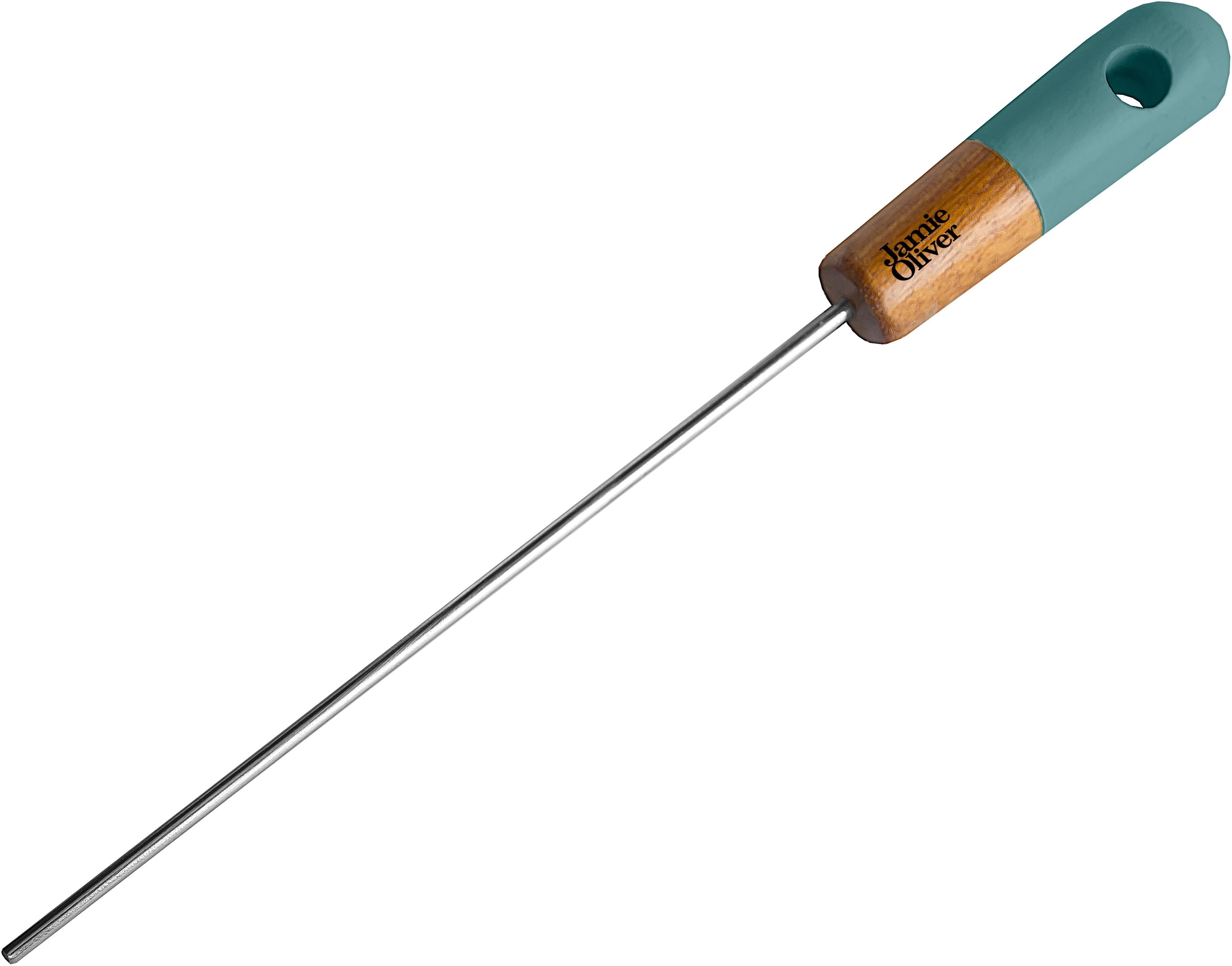 Tester do kontroli stopnia wypieczenia domowych wypieków, np. biszkoptów i babek. Jamie Oliver to znany i ceniony na całym świecie kucharz, który w oparciu o swoją kuchenną wiedzę i doświadczenie w tej dziedzinie stworzył serię kuchennych przyborów, m.in. serii narzędzi kuchennych Get Creative. Tester wykonany z cienkiego pręcika odpornego na zniekształcenia pod wpływem wysokiej temperatury. Nie pozostawia nieestetycznych otworów na wypiekach, pozwalając jednocześnie na sprawdzenie czy przygotowywane ciasto jest już gotowe. Uchwyt wykonany z drewna akcjowego, którego końcówka zabarwiona jest na kolor atlantyckiej zieleni. Uchwyt zakończony jest otworem, dzięki czemu tester można przechowywać na wieszaku relingu kuchennego. Główne zalety: wykonany z cienkiego metalowego pręcika uchwyt z drewna akacjowego oraz tworzywa pomaga sprawdzić stopień wypieczenia ciast posiada uchwyt umożliwiający zawieszenie narzędzia na haczyku 2 lata gwarancji producenta