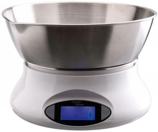 Kuchenna waga z misą do ważenia suchych, a także mokrych składników. Jamie Oliver to znany i ceniony na całym świecie kucharz, który w oparciu o swoją kuchenną wiedzę i doświadczenie w tej dziedzinie stworzył serię kuchennych przyborów, m.in. cyfrową wagę kuchenną z misą. Elektroniczna waga do pomiaru suchych i mokrych składników wyposażona w funkcję tary, a także możliwość zmiany jednostek wagi. Duży cyfrowy wyświetlacz zapewnia czytelny odczyt podczas ważenia. Metalowa misa posiada dziubek ułatwiający odlewanie ważonych płynów. Waga po starowaniu może być używana z dowolnym naczyniem, np. szklanką czy niewielkim garnkiem. Waga waży z dokładnością 1 g, maksymalna nośność wagi to 5 kg. Główne zalety: wykonana z szarego tworzywa w zestawie metalowa misa z dziubkiem duży, czytelny wyświetlacz funkcja tary oraz możliwość zmiany jednostek waży z dokładnością 1 grama maksymalna nośność 5 kg 2 lata gwarancji