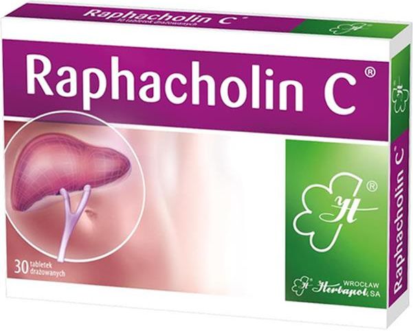 Raphacholin C® jest to produkt leczniczy stosowany tradycyjnie, którego skuteczność w wymienionych wskazaniach opiera się wyłącznie na długim okresie stosowania i doświadczeniu. Raphacholin C® zawiera w składzie wyciąg suchy z korzenia rzodkwi czarnej z węglem leczniczym (1:1), wyciąg gęsty z ziela karczocha, kwas dehydrocholowy oraz olejek miętowy. Jest lekiem działającym żółciopędnie i żółciotwórczo (wywiera bezpośredni wpływ na wątrobę, pobudza wydzielanie żółci). Regularne przyjmowanie preparatu pobudza wydzielania żółci, co działa ochronnie na miąższ wątroby, przyspiesza eliminację z żółcią szkodliwych substancji i wzmaga ruchy perystaltyczne jelit. Raphacholin C® tradycyjnie stosuje się w niestrawności, dolegliwościach trawiennych związanych z dysfunkcją wątroby (wzdęcia, bóle brzucha, odbijania, nudności, zaparcia), zaburzeniach aktywności skurczowej pęcherzyka żółciowego. 1 tabletka drażowana zawiera: Substancje czynne: raphani sativi nigri radicis extractum siccum cum carbo medicinalis (wyciąg suchy z korzenia rzodkwi czarnej z węglem leczniczym) (1:1) – 150 mg ( DER 18:1, ekstrahent: etanol 85 % V/V ) cynarae herbae extractum spissum (wyciąg gęsty z ziela karczocha) – 47 mg (DER 3:1, ekstrahent: etanol 50 % V/V ) acidum dehydrocholicum (kwas dehydrocholowy) – 40 mg menthae piperitae oleum (olejek miętowy) – 15 mg Substancje pomocnicze: sacharoza, krzemionka koloidalna bezwodna, magnezu stearynian,talk, guma arabska, wapnia wodorofosforan dwuwodny, powidon, celuloza mikrokrystaliczna, substancja barwiąca  (tlenek żelaza czarny + dwutlenek tytanu). Dorośli: w niestrawności jednorazowo 1 do 3 tabletek w innych dolegliwościach trawiennych przeciętnie 3 razy dziennie po 1 do 2 tabletek 30 min. po posiłku ​w zaparciach 2 tabletki rano i wieczorem na ½ godziny przed jedzeniem Po konsultacji z lekarzem, u dzieci powyżej 10 lat 1 tabletkę 3 razy dziennie po posiłku. Nie należy stosować leku przy nadwrażliwości na którykolwiek ze składników leku, ciężkich chorobach wątroby, niedrożności dróg żółciowych i przewodu pokarmowego, ostrych i przewlekłych stanach zapalnych żołądka i jelit. W przypadku kamicy żółciowej lek stosować po konsultacji z lekarzem.