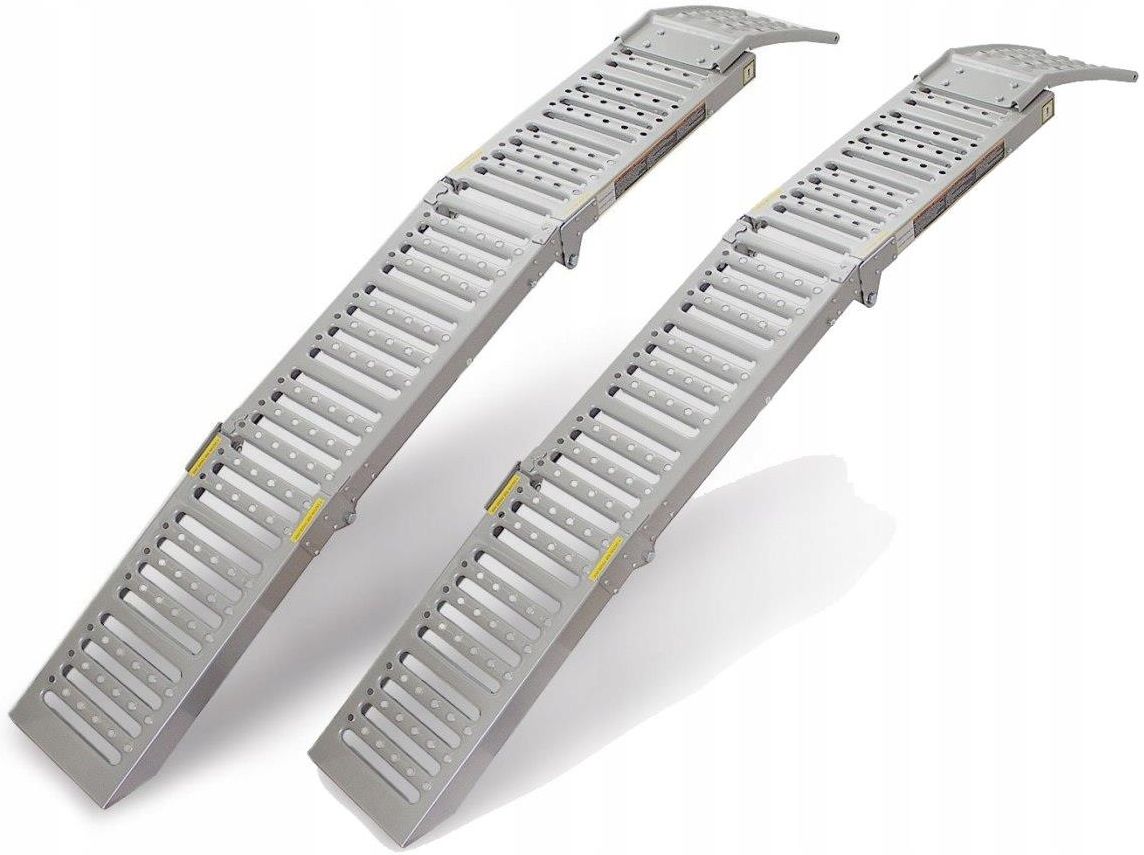 NAJAZD - RAMPA ALUMINIOWA - NOŚNOŚĆ 2200 KG (2 SZTUKI) Zestaw ramp najazdowych w formie szyn. Produkt jako rozłożony posiada udźwig do 250kg na jedną rampę, jest idealny do załadunku niewielkich pojazdów takich jak quady, motocykle, kosiarki traktorki. Świetnie sprawdzą się również jako podjazd dla wózków inwalidzkich. Rampy przy złożonym trybie posiadają wytrzymałość aż do 1,1T na pojedynczy najazd. Świetnie uniosą również większe, ciężkie maszyny, o łącznej wadze do 2200Kg. Szyny są lekkie, ważą jedynie 13,7kg na jedna, oraz są bardzo łatwe w przenoszeniu czy w transporcie autem. Ryflowana, antypoślizgowa struktura zapewnia dobrą przyczepność. Rampy wykonane z wysokiej jakości stali, a dosyć lekkiej konstrukcji. Świetne do załadunku na przyczepy, czy samochody dostawcze. Cechy Produktu: - solidne, łatwe w obsłudze, - szorstka perforacja zapewnia doskonałą przyczepność, - nadają się do codziennego użytku, - wspaniała jakość i uniwersalne zastosowanie Dane Techniczne: Wymiary: 200cm x 27cm x 16cm (dług/szer/wys), Wymiary po złożeniu: 58cm x 27cm x 16cm (dług/szer/wys), Ładowność (rozłożone): 250kg (każda), Ładowność (złożone): 1100kg (każda), Długość: 200cm, Długość po złożeniu: około. 58cm, Szerokość najazdu: około 25cm, Materiał: Stal, Waga: 13,5 kg (każda) W Zestawie: 2x Stalowe rampy składane,