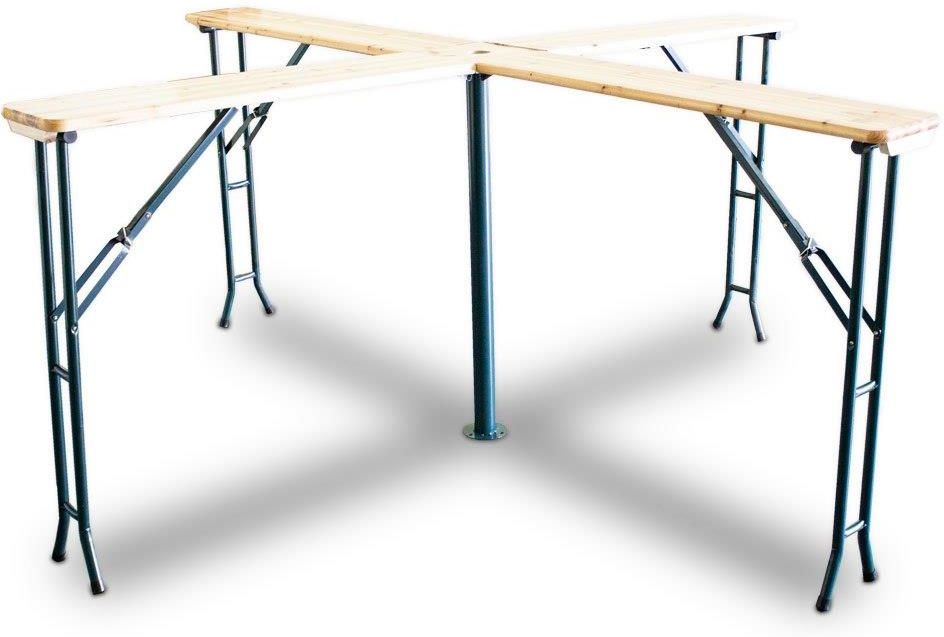 Krzyżowy stół barowy piwny składany WYMIARY KARTONU: 118 x 31 x 31cm, WAGA 23KG Przy stole piwnym w kształcie krzyża może zasiąść do 20 osób. Można go łączyć z innymi zestawami i meblami ogrodowymi i doskonale nadaje się na uroczystości takie jak urodziny, dożynki czy przeróżne imprezy firmowe. W kilku prostych krokach można złożyć podstawę wykonaną z wytrzymałej stali, dzięki czemu stół może być przechowywany i transportowany w sposób oszczędzający miejsce. Blat stołu wykonany jest z solidnego, wytrzymałego drewna i posiada stabilną wnękę na parasol. SPECYFIKACJA TECHNICZNA: Wymiary (dł/szer/wys): 241 x 241 x 103 cm, Wymiary (dł/szer/wys) po złożeniu: 30 x 30 x 114 cm, Długość ramienia stołu: 108 cm, Wysokość: 103 cm, Otwór na parasol: 55mm, Materiał: lakierowany świerk, powlekana stalowa rama, plastikowe nóżki, Waga: ok. 21 kg.