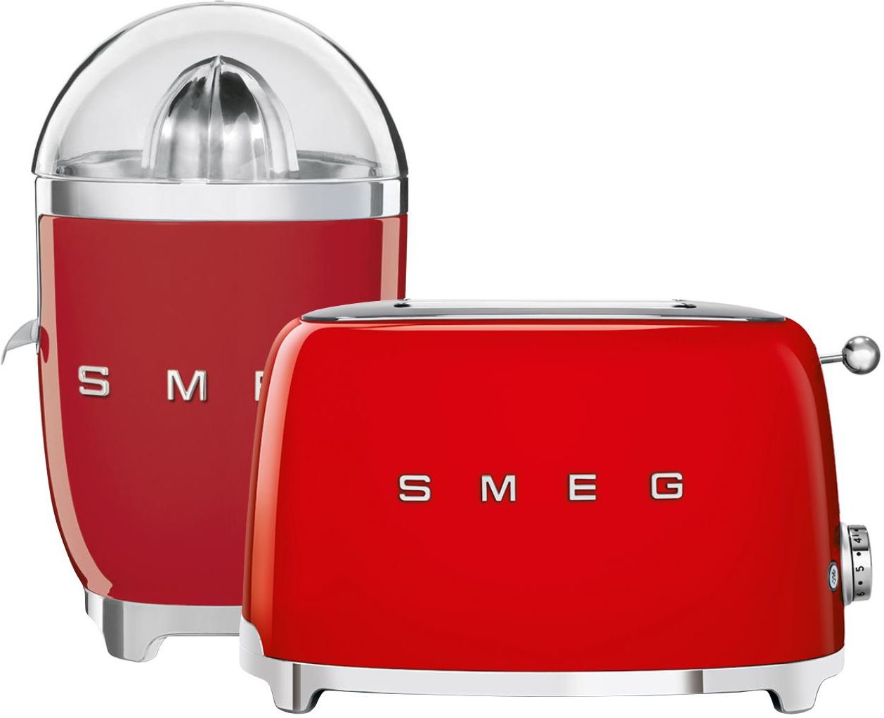 Zestaw śniadaniowy 50's Retro Style Prezentowany zestaw śniadaniowy produktów z linii 50’s Retro Style marki Smeg to doskonały duet ułatwiający przygotowanie porannego posiłku z dodatkiem świeżo wyciskanego soku. Wykonane z wysokiej jakości materiałów - m.in. tworzywa i stali nierdzewnej - urządzenia dzięki opływowym kształtom, chromowanym podstawom oraz intensywnemu czerwonemu kolorowi elegancko zaprezentują się na blacie kuchennym, uzupełniając współczesne wystroje - można je więc będzie przechowywać na widoku, gdy akurat nie będą używane. Toster na dwie kromki posiada komory o szerokości 36 mm. Pieczywo automatycznie umieszczane jest na ich dnie oraz automatycznie wysuwane po zakończeniu cyklu opiekania, co przyspiesza przygotowywanie tostów. Sześciostopniowa regulacja umożliwia łatwą kontrolę poziom opiekania. Natomiast trzy programy pracy pozwalają na podgrzewanie kromek, rozmrażanie pieczywa oraz przygotowywanie bajgli, co tylko zwiększa zastosowania tostera. Zainstalowana wewnątrz, łatwa w opróżnianiu tacka zbiera okruchy, zapobiegając powstawaniu niepotrzebnego bałaganu wokół urządzenia. Funkcje tostera: 6 stopni opiekania 3 programy: podgrzewanie, rozmrażanie, bajgiel Elektryczna wyciskarka do cytrusów pozwoli na łatwe uzyskanie świeżego soku z cytryn, pomarańczy czy grejpfrutów. Posiada ona silnik ze zintegrowanym czujnikiem włączania / wyłączania. Wyposażona została w dzióbek z zabezpieczeniem przed kapaniem, który ogranicza zabrudzenia na jej powierzchni pozwalając na wygodne przelewanie soku do dzbanków czy szklanek. Stożek wyciskający wykonano ze stali nierdzewnej, tak samo filtr, dzięki czemu urządzenie jest trwałe i odporne na korozję. Antypoślizgowe nóżki zapewniają większą stabilność podczas pracy z wyciskarką, a schowek na przewód zasilający ułatwia jego przechowywanie. Dodatkowo urządzenie posiada pokrywkę z przezroczystego Tritanu bez BPA, która chroni je przed kurzem, ułatwiając czyszczenie. Charakterystyka wyciskarki: Stożek wyciskający ze stali nierdzewnej Filtr ze stali nierdzewnej  Pokrywka z TritanTM wolna od BPA Dzióbek z zabezpieczeniem przed kapaniem ze stali nierdzewnej  Pojemnik na sok z TritanTM wolny od BPA Schowek na przewód zasilający Nóżki antypoślizgowe