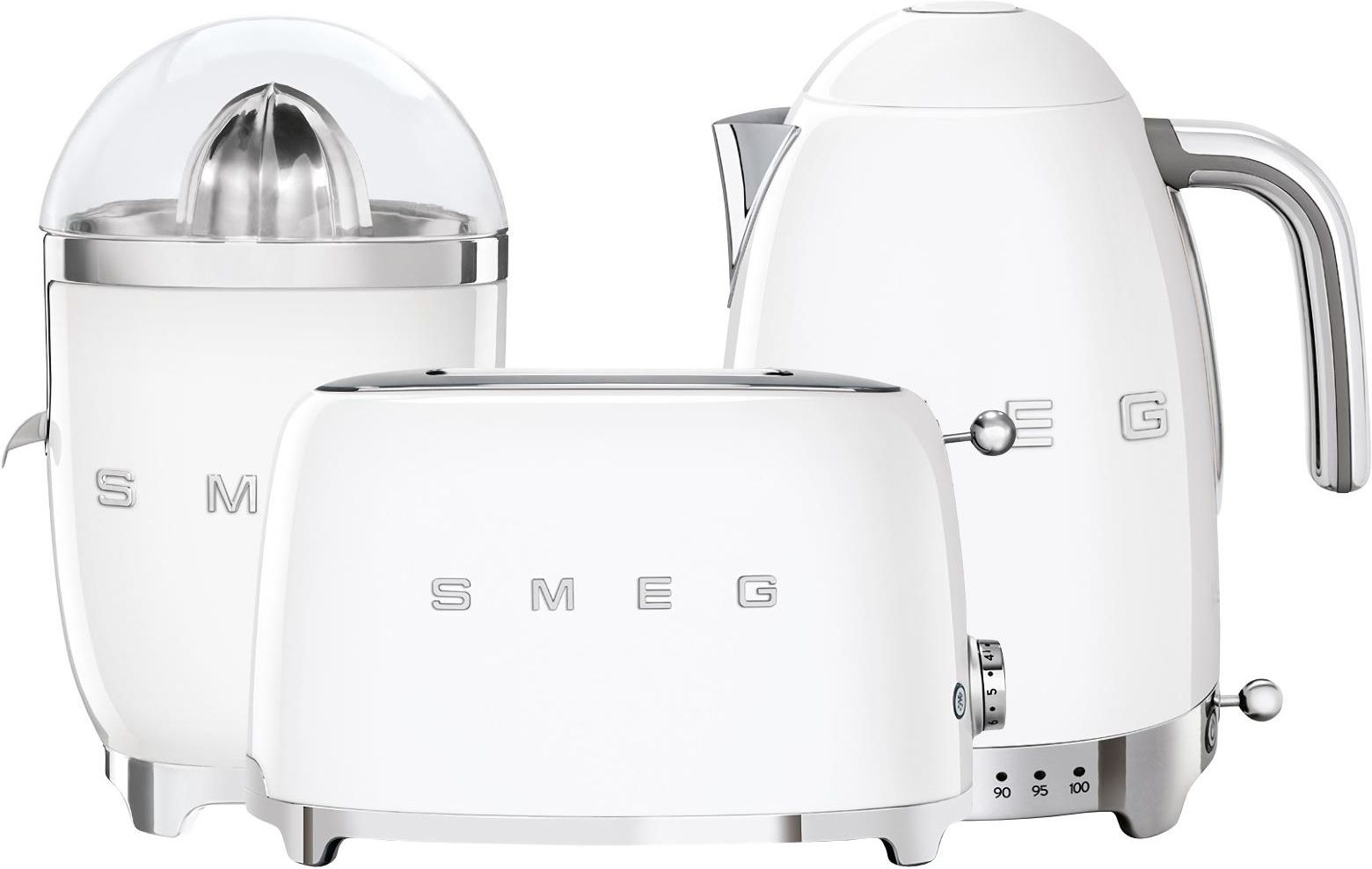 Zestaw śniadaniowy z KLF04 Rozszerzony 50's Retro Style Oferowany zestaw śniadaniowy produktów z linii 50’s Retro Style marki Smeg ułatwi i przyśpieszy przygotowywanie codziennych posiłków z dodatkiem świeżo wyciskanego soku. Wykonane z wysokiej jakości materiałów - m.in. tworzywa i stali nierdzewnej - urządzenia mają przemyślany design o opływowych kształtach i chromowanych podstawach, który w połączeniu z neutralnym białym kolorem sprawia, że świetnie zaprezentują się one na blacie kuchennym - można je będzie przechowywać na widoku, gdy akurat nie będą używane. Czajnik o pojemności 1,7 L z pokrywką otwieraną przy użyciu systemu Soft Opening posiada w swoim wnętrzu bezpieczny i praktyczny system grzewczy z ukrytymi elementami grzewczymi. Bezpieczeństwo użytkowania zapewniają automatyczne wyłączanie się po zagotowaniu wody, brak możliwości uruchomienia przy pustym zbiorniku oraz antypoślizgowe, gwarantujące stabilność nóżki. Dodatkowo urządzenie posiada przycisk regulacji temperatury, dzięki któremu można uruchomić próg grzania od minimum 50 do maksimum 100°C, co pozwoli na dostosowanie temperatury wody do własnych potrzeb. Przycisk Keep warm umożliwi z kolei utrzymanie ciepła wody na dłużej - wodę będzie można ugotować wcześniej i poczekać z obsłużeniem gości na odpowiedni moment. Ponadto czajnik wyposażony został w wyjmowany filtr wapienny ze stali nierdzewnej, który ogranicza osadzanie się kamienia w jego wnętrzu. Zaletą produktu jest także podstawa umożliwiająca obracanie w zakresie 360 stopni. Zalety czajnika: Otwieranie pokrywki z systemem Soft Opening  Antypoślizgowe nóżki stabilizujące urządzenie Regulacja temperatury wody od 50 do 100°C Funkcja Keep warm - utrzymywanie ciepła na dłużej Wyjmowany filtr wapienny ze stali nierdzewnej Automatyczne wyłączenie przy 100°C Automatyczne wyłączenie przy pustym czajniku Obracanie czajnika na podstawie 360° Toster na dwie kromki posiada komory o szerokości 36 mm. Pieczywo automatycznie umieszczane jest na ich dnie oraz automatycznie wysuwane po zakończeniu cyklu opiekania, co przyspiesza przygotowywanie tostów. Sześciostopniowa regulacja daje możliwość kontroli poziomu opiekania. Natomiast trzy programy pracy pozwalają na podgrzewanie kromek, rozmrażanie pieczywa oraz przygotowywanie bajgli, co zwiększa zastosowania tostera. Zainstalowana wewnątrz, łatwa w opróżnianiu tacka zbiera okruchy, zapobiegając powstawaniu niepotrzebnego bałaganu wokół urządzenia. Funkcje tostera: 6 stopni opiekania 3 programy: podgrzewanie, rozmrażanie, bajgiel Elektryczna wyciskarka do cytrusów pozwoli na łatwe uzyskanie świeżego soku z cytryn, pomarańczy czy grejpfrutów. Posiada ona silnik ze zintegrowanym czujnikiem włączania / wyłączania. Wyposażona została w dzióbek z zabezpieczeniem przed kapaniem, który ogranicza zabrudzenia na jej powierzchni pozwalając na wygodne przelewanie soku do dzbanków czy szklanek. Stożek wyciskający wykonano ze stali nierdzewnej, tak samo filtr, dzięki czemu urządzenie jest trwałe i odporne na korozję. Antypoślizgowe nóżki zapewniają większą stabilność podczas pracy z wyciskarką, a schowek na przewód zasilający ułatwia jego przechowywanie. Dodatkowo urządzenie posiada pokrywkę z przezroczystego Tritanu bez BPA, która chroni je przed kurzem, ułatwiając czyszczenie. Charakterystyka wyciskarki: Stożek wyciskający ze stali nierdzewnej Filtr ze stali nierdzewnej  Pokrywka z TritanTM wolna od BPA Dzióbek z zabezpieczeniem przed kapaniem ze stali nierdzewnej  Pojemnik na sok z TritanTM wolny od BPA Schowek na przewód zasilający Nóżki antypoślizgowe