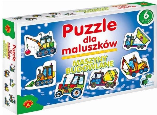 Puzzle dla Maluszków – Maszyny Budowlane Początek dziecięcej przygody z puzzlami. Puzzle przeznaczone dla najmłodszych (od 2 roku życia). Atrakcyjna kolorystyka , proste, przyjemne dla dzieci formy oraz duże i nieskomplikowane klocki, pomagają dzieciom w prawidłowym rozwoju. Dzięki 3mm grubości maluszkom łatwo będzie chwytać i dopasować do siebie poszczególne elementy. Każde opakowanie zawiera 6 wzorów, które składają się z różnej liczby elementów (od 2 do 7). Dzięki temu dziecko może stopniowo poznać cel i sens zabawy odkrywając zasady łączenia ze sobą poszczególnych części Zawartość opakowania 27 puzzli Produkty
