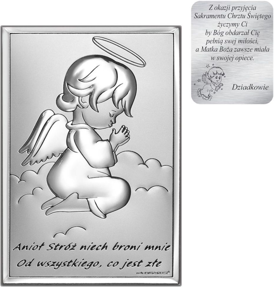 Obrazek srebrny Aniołek modlący się, z podpisem: "Anioł Stróż niech broni mnie od wszystkiego, co jest złe". Idealny jako pamiątka z okazji Chrztu Świętego lub prezent z okazji narodzin dziecka. Obrazek wyprodukowany został przez firmę Beltrami. Gwarantuje ona, iż przedmiot nabyty przez Państwa został wyprodukowany we Włoszech, zgodnie z kunsztem i tradycją obróbki metali szlachetnych. Do produkcji wykorzystano innowacyjny metal szlachetny o nazwie MIRO-SILVER, opatentowany na terytorium całej Europy. Jest to nowoczesny surowiec pokryty w procesie atomowym warstwą czystego srebra 999,95. Otrzymany drogocenny metal posiada wyjątkowe cechy, przewyższając jakością materiały pozyskiwane metodami tradycyjnymi. Jest odporniejszy na odkształcenia mechaniczne i śniedzenie, doskonale odbija światło, co podkreśla szlachetność srebra. Obrazek zabezpieczony jest warstwą lakieru, która chroni przed czynnikami zewnętrznymi. Wpływa to na bezproblemowe użytkowanie bez potrzeby częstego czyszczenia. Obrazek można zarówno powiesić, jak i postawić na dołączonej podstawce. Do czyszczenia zalecamy używanie wyłącznie czystych, miękkich ściereczek, a w przypadku zabrudzeń letniej wody. Nie należy stosować detergentów, alkoholu ani znajdujących się w sprzedaży środków i ściereczek do czyszczenia srebra, gdyż mogą one uszkodzić warstwę ochronną.