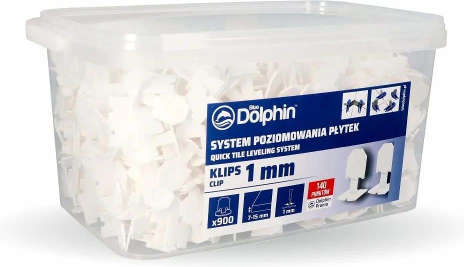 Klipsy 1mm do Systemu Poziomowania Płytek Blue Dolphin Opakowanie zawiera 900 sztuk klipsów w wybranym rozmiarze. System umożliwia poziomowanie płytek grubości 7-15mm. System poziomowania to innowacyjny system zwiększający wydajność pracy oraz precyzję podczas układania płytek. Dzięki zastosowaniu najlepszej jakości materiałów oraz odpowiedniej ergonomii poszczególnych elementów, wykonawca uzyskuje idealny efekt końcowy. Odpowiednio cienka podstawa klipsa ułatwia jego usunięcie po zakończonej pracy. System przeznaczony jest do płytek grubości 7-15 mm. Klipsy różnią się kolorami w zależności od szerokości fugi jaką wykonawca chce zastosować: 1mm, 1,5mm, 2mm, 3mm. Można stosować z kleszczami zaciskowymi lub bez dodatkowych narzędzi. Właściwości: Wysoka wytrzymałość. Łatwy montaż. Możliwość stosowania na ściany i podłogi. Dzięki nowej płaskiej podstawie zużywa się mniej kleju. Orientacyjna liczba klipsów potrzebnych do wypoziomowania powierzchni 1m²: 30x30 - 42 szt. 33x33 - 36 szt. 40x40 - 28 szt. 45x45 - 24 szt. 50x50 - 20 szt. 60x60 - 10 szt. 80x80 - 10 szt. 100x50 - 16 szt. 120x60 - 10 szt. Blue Dolphin to firma specjalizująca się w produkcji wysokiej jakości materiałów i akcesoriów do malowania i dekoracji wnętrz. Ich oferta obejmuje szeroki asortyment produktów, takich jak taśmy malarskie, folie ochronne, narzędzia do aplikacji farb oraz inne akcesoria niezbędne profesjonalistom i amatorom podczas prac remontowych i dekoracyjnych. "Blue Dolphin" wyróżnia się na rynku dzięki innowacyjności, stosowaniu nowoczesnych technologii oraz skupieniu na potrzebach i oczekiwaniach klientów. Firma zyskała uznanie na rynku dzięki swojemu zaangażowaniu w produkcję ekologiczną i trwałą, oferując produkty, które są zarówno efektywne w użyciu, jak i przyjazne dla środowiska. Przez lata "Blue Dolphin" zbudował silną pozycję na rynku, stając się synonimem jakości i niezawodności wśród profesjonalistów branży budowlanej i dekoracyjnej.