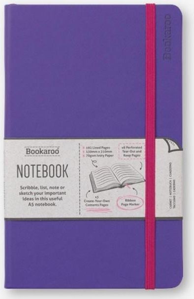 Nowoczesny Notatnik Journal A5 w modnym kolorze fioletowym od Bookaroo Prezentujemy Państwu elegancki notatnik Bookaroo zdobiony twardą, fioletową okładką. Zawiera w sobie 192 strony w linie, z których 8 jest wyposażonych w perforację dla łatwego wyrywania. Notatnik jest wykonany z papieru ośmiorniczej jakości, który charakteryzuje się ładnym kolorem kości słoniowej. Design tego notatnika jest praktyczny i nowoczesny - posiada on wstążkę-zakładkę, która pozwala na szybkie odnajdywanie ostatniego miejsca zapisu. Plus użytkowania tego notatnika to elegancka gumka do zamykania, która utrzymuje notatnik zamkniętym i chroni Twoje notatki. Zapraszamy do zakupu tego stylowego notatnika Bookaroo - idealnego dla każdego, kto ceni sobie elegancję i funkcjonalność w jednym! EAN: 5035393432430