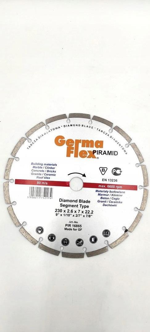 Tarcza diamentowa segmentowa Piramid Segment 230x2 Tarcza diamentowa - segmentowa - 230x22,23mm - Germa Flex PIR16865 Dane techniczne Model: PIR 16865Rozmiar: 230x2,6x7x22,2Typ: segmentowaPrzeznaczenie: mat. budowlane, marmur, klinkier, beton, cegła, granit, ceramika, dachówkiGrubość: 2,6Charakterystyka: 6600rpm Tarcza diamentowa segmentowa marki GERMAFLEX model PIR16865 służy do cięcia materiałów budowlanych, marmuru, klinkieru, betonu, cegły, granitu, ceramiki i dachówki.Piramid Segment to tarcza charakteryzująca się wąskim rzazem cięcia.Tarcze segmentowe są przeznaczone do twardych materiałów, które wymagają najwyższej trwałości tarcz. 5908211752174 000100