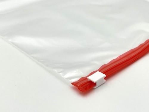 Woreczek strunowy z suwakiem SLIDER Szerokość:230 mm Długość: 320 mm Grubość: 70 µ Kolor struny: czerwony Kolor kursora: biały Materiał: polietylen małej gęstości LDPE Opakowanie jednostkowe: 50 szt. Opakowanie zbiorcze karton: 1 000 szt