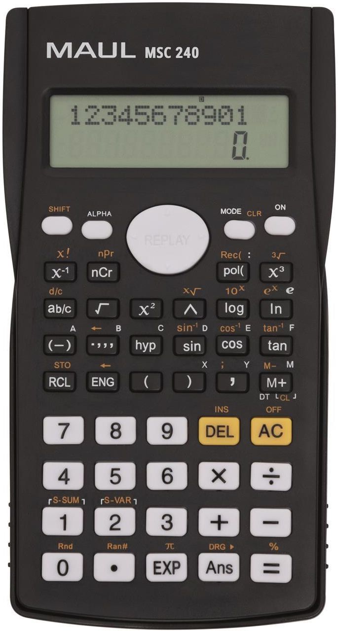 Kalkulator biurowy naukowy MSC 240 12-pozycyjny, z dwomia liniami wyświetlania, marki MAUL Kalkulator naukowy Maul MSC 240 w kolorze czarnym z dwuliniowym, 12-pozycyjnym wyświetlaczem LCD. Posiada 240 funkcji do obliczania złożonych działań i zaawansowanych operacji. Niezawodny i dokładny. Oblicza między innymi funkcje trygonometryczne, logarytmiczne (log i ln), ułamki, pierwiastki, potęgowanie, silnię i wiele innych. Z funkcją automatycznego wyłączania. Opakowanie z tektury z eurozawieszką. Instrukcja do kalkulatora w wersji online - należy zeskanować dołączony kod QR za pomocą aparatu w smartfonie lub aplikacji do odczytu kodów QR, natychmiast uzyskując dostęp do informacji o urządzeniu. MAUL 100 lat doświadczenia w kreacji oraz produkcji niszowych, unikalnych, bardzo wysokiej jakości produktów biurowych. Ofertę tej niemieckiej marki tworzą m.in. specjalistyczne wagi biurowe, niepowtarzalna seria akcesoriów nabiurkowych, charakteryzujące się nowoczesnym designem oraz niskim zużyciem energii lampki nabiurkowe.