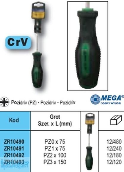 ZR10490 Wkrętak Pozidriv PZ0x75mm [Z] jeżyk CV Wkrętak płaski typu "" Jeżyk"" Groty wykonane ze stali chromowo-wanadowej, hartowane Antypoślizgowe rękojeści ze wstawkami gumowymi Magnetyczne końcówki grotów