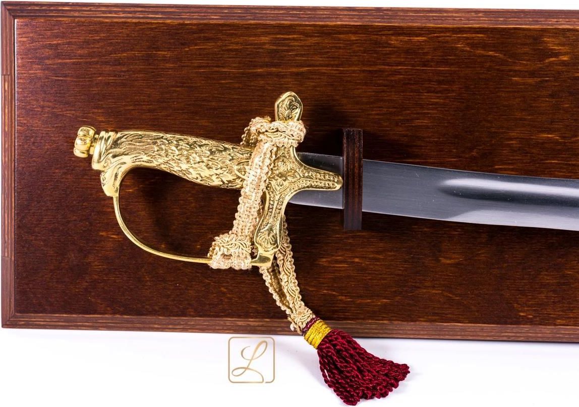 Szabla upominkowa generała Władysława Sikorskiego z 1920 r., klinga obustronnie gładka, w komplecie z wiszącym tablo.Opis szabli: Szabla tzw. upominkowa będąca prezentem imieninowym dla generała Władysława Sikorskiego od jego podkomendnych, ofiarowana mu w 1920 r.. Głownia wykonana ze stali, szlifowana, polerowana, obustronnie gładka. Rękojeść w całości odlewana z mosiądzu. Głowica rękojeści ma kształt głowy orła zwieńczonej koroną. Jelec krzyżowy zdobiony ornamentami kwiatowymi, na tle karpiej łuski. Do rękojeści przywiązany ozdobny temblak wykonany z materiałowej taśmy zakończonej chwostem-pęczkiem w kolorze bordowym. Tablo wykonane ze sklejki, bejcowane i lakierowane na mat. Na tyłach tabla dwa haczyki do powieszenia na ścianie. Dzieło polskiego rzemieślnika do prezentacji broni białej. Możliwość wykonania tabliczki z dedykacją przyklejaną na środek tabla nad szablą. Wymiary: długość szabli - 94 cm długość głowni - 82 cm szerokość głowni u nasady -3 cm grubość grzbietu u nasady - 0,4 cm waga - 1,1 kg Tablo: długość: 100 cm wysokość: 20 cm grubość deski: 2 cm szerokość szczeliny na klingę: ok. 0,6 cm waga: 0,87 kg Sposób pielęgnacji: Zalecamy, aby głownia i pochwa co jakiś czas były konserwowane bardzo cienką warstwą oliwki np.: ciekłej parafiny. Pomoże to w utrzymaniu wysokiej jakości produktu. Idealny prezent dla faceta, prezent dla kolegi odchodzącego z pracy. Praktyczne rozwiązanie na moment wręczania !!! Możliwość wykonania dedykacji na klindze i tabliczki przyklejanej na deskę. Replika szabli nieostrzona, wiernie odzwierciedla oryginał, jednak nie posiada żadnych cech użytkowych (w rozumieniu ustawy o broni i amunicji z dnia 21 maja 1999 r. — Dz.U. z 2012 poz. 576 wraz z późniejszymi zmianami).