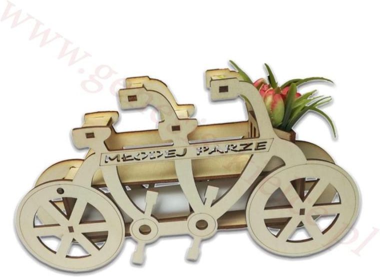 Pamiątka ślubna z napisem MŁODEJ PARZE w kształcie roweru tandem. W pamiątce schowane są również życzenia. Ręcznie wykonana ze sklejki. Zapakowana w ozdobną folię.