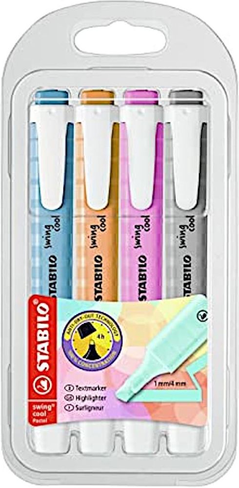 Zakreślacz Swing Cool Pastel 4 kolory STABILO. Etui zawiera 4 zakreślacze w najnowszych kolorach pastelowych: szary, lilia jasny, brzoskwiniowy, błękitny. Wszystkie zakreślacze charakteryzują się: wentylowaną skuwką i wygodnym klipsem (do przypięcia do dokumentów lub teczki), atramentem na bazie wody, piszą na wszystkich rodzajach papieru (również faksowym i samokopiującym), podwójna szerokość pisania, 1 i 4 mm (w zależności od ułożenia w dłoni), technologia STABILO Anti Dry-Out: dzięki której możliwe jest pozostawienie zakreślaczy bez zamknięcia przez 4 godziny bez wyschnięcia końcówki, antypoślizgowe paski na uchwycie ułatwiają zakreślanie.