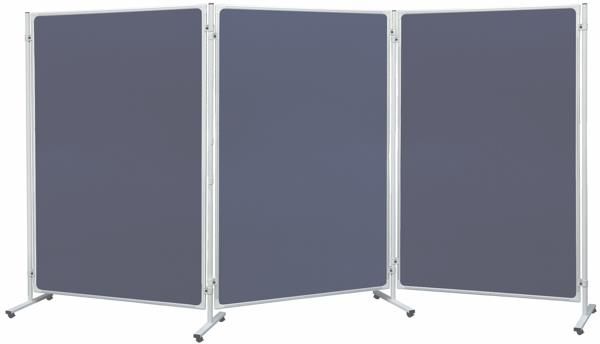 Tablica moderacyjna tekstylna 3 częściowa 120×180 cm ścianka moderacyjna szara typu parawan Dwustronna tablica moderacyjna o powierzchni tekstylnej. Tablice moderacyjne (parawany) są doskonałym rozwiązaniem jako ścianka prezentacyjna podczas wystaw i galerii zdjęć, rysunków i różnego typu ogłoszeń. Mogą być również wykorzystane w miejscach, gdzie istnieje potrzeba fizycznego przedzielenia przestrzeni w estetyczny sposób. Zestaw zawiera: – 3 tablice tekstylne dwustronne w kolorze popielatym o wymiarach 120×180 cm , 4 nogi, niezbędne uchwyty – łączniki i opcjonalne kółka – tablica tekstylna obustronna w ramie aluminiowej – rama wykonana z profilu aluminiowego w kolorze srebrnym, wykończona eleganckimi narożnikami w kolorze szarym – mocowana na specjalnych nogach o wysokości 190 cm – możliwość zamontowania kółek (z systemem blokującym) – gwarancja 2 lata na produkt – aktualny czas produkcji sprawdzisz w naszym dziale handlowym Tablica wystawowa umożliwia samodzielny montaż w dowolnej konfiguracji zarówno w kształcie i rodzajach powierzchni, do wyboru o powierzchni do wyboru: suchościeralnej, korkowej lub tekstylnej. O szczegóły zapytaj w naszym dziale handlowym.