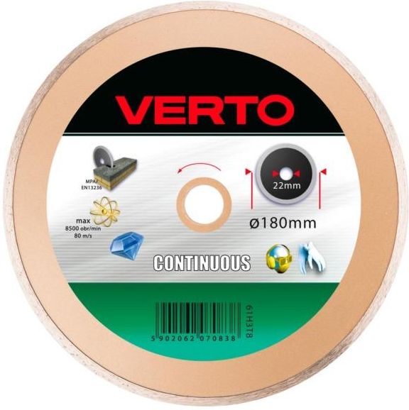 Tarcza diamentowa 180 x 22.2 mm, pełna Tarcza diamentowa pełna VERTO (nr ref. 61H3T8) o średnicy zewnętrznej 180 mm, przeznaczona do precyzyjnego cięcia elementów ceramicznych, takich jak terakota, gres, granit, marmur. Marka VERTO oferuje asortyment elektronarzędzi i akcesoriów dla każdego majsterkowicza. Waga netto: 320 g Ilość sztuk w zestawie: 1 szt Grubość: 2 mm Typ tarczy: diamentowa Do ceramiki: Tak Opakowanie: podwójny blister Średnica zewnętrzna tarczy: 180 mm Średnica wewnętrzna tarczy: 22.2 mm Wysokość segmentu: 7 mm Pełna: Tak Rodzaj akcesoriów do elektronarzędzi: tarcza Waga opakowania: 0.38 kg Szerokość opakowania: 21.50 cm Wysokość opakowania: 0.60 cm Długość opakowania: 25.50 cm Tarcza diamentowa 180 x 22.2 mm, pełna
