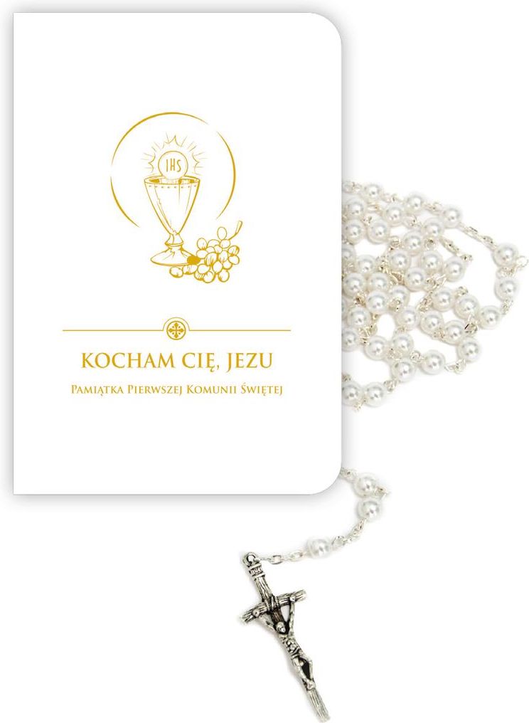 Zestaw komunijny - modlitewnik Kocham Cię Jezu + różaniec perłowy Modlitewnik: Książeczka zawiera modlitwy na każdą okazję, dostosowane do wieku i rozwoju dziecka. Znajdują się w niej również rozważania różańcowe, Drogi Krzyżowej i litanie. Dodatkowym atutem są komentarze ułatwiające zrozumienie Mszy Świętej oraz ułatwiające przygotowanie do spowiedzi. W książeczce znajduje się miejsce na uzupełnienie ważnych dat w życiu każdego chrześcijanina (chrztu, pierwszej spowiedzi, Komunii Świętej), a także miejsce na zebranie podpisów spowiednika na 9 Pierwszych Piątków Miesiąca. Modlitewnik przykuwa uwagę swoją wyjątkową, atrakcyjną i przejrzystą szatą graficzną. Dostępny jest w dwóch kolorach – białym (dla dziewczynek) oraz granatowym (dla chłopców). Książeczka posiada zaokrąglone narożniki, przez co jest trwalsza i bardziej odporna na zniszczenia. Różaniec komunijny biała perła zachwyca estetycznym wykonaniem. Trwałe surowce, z których powstaje, sprawiają, że przez wiele lat zachowa swój pierwotny wygląd. Wielkość koralika: 5 mm