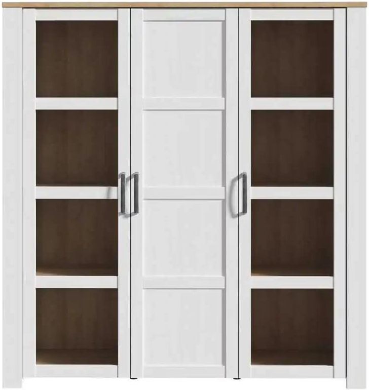 Przeszklona witryna z kolekcji Chisbury łączy w sobie klasyczną i nowoczesną stylistykę. Najlepiej sprawdzi się jednak we wnętrzach urządzonych w stylu skandynawskim, prowansalskim lub rustykalnym. Mebel ma jasną kolorystykę i ponadczasowy design. Dzięki oświetleniu przeszklonych szafek pomaga wyeksponować najpiękniejsze dodatki, które nadają osobisty charakter wszystkim aranżacjom. Gdzie sprawdzi się biała witryna? Biała witryna szklana to propozycja do przytulnie urządzonego salonu lub jadalni. Mebel odnajdzie się doskonale w aranżacji wykorzystującej jasne kolory i naturalne materiały. Witryna może stanowić idealne przejście między strefą wypoczynkową pokoju dziennego a strefą jadalnianą. Za jej szklanymi frontami warto przechowywać przedmioty pełniące rolę dekoracyjną. W szafkach z frontem klasycznym można zamknąć natomiast tekstylia i rzadziej wykorzystywaną zastawę stołową. Jakie zalety ma witryna do salonu Chisbury? Prezentowana elegancka witryna do salonu z kolekcji Chisbury ma na tyle ponadczasowy i uniwersalny design, że powinna z powodzeniem dotrzymać kroku każdej osobie, która lubi zmiany w swoim otoczeniu. Jasny kolor frontów i korpusu tego mebla, wybarwiony na odcień modrzewia Sibiu sprawia, że witryna elegancko rozświetla pomieszczenie. Natomiast cieplejszy odcień wnęk w kolorze dąb Riviera podkreśla naturalny charakter tego elementu wyposażenia, pożądany nie tylko w stylu rustykalnym, ale również w nowoczesnym stylu skandynawskim. Wymiary witryny Szerokość: 151,1 cm Głębokość: 42 cm Wysokość: 160,6 cm