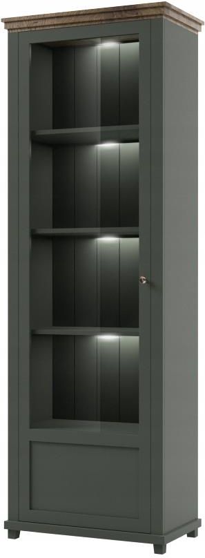 Wysoka witryna PEVORA typ 06 Elegancka, wysoka witryna idealnie urozmaici aranżację klasycznego salonu, czy jadalni. Witryna za częściowo przeszklonymi drzwiami posiada liczne półki, które za dodatkową opłatą możemy doposażyć w energooszczędne oświetlenie LED. Witryna świetnie wyeksponuje elegancka zastawę stołową, czy serwis kawowy. Wyjątkowy styl mebla podkreślają cokoły w kolorze dębu lefkas, delikatne frezowania frontów oraz ozdobne uchwyty gałkowe. Kolor: dab lefkas/zielony, Wymiary: Szerokość - 71 cm Głębokość - 42 cm Wysokość -200 cm Mebel wysyłany jest w paczkach do samodzielnego montażu. Kolekcja Evora idealnie wkomponuje się w klasyczne wnętrze. Połączenie ciemnego koloru z tradycyjnym jasnym drewnem to propozycja dla miłośników elegancji. Seria doskonale sprawdzi się w pokoju dziennym, w salonie oraz w jadalni. Do Państwa dyspozycji są komody, witryny i wisząca półka. Uzupełnieniem kolekcji jest stolik kawowy i stół rozkładany. Meble dostępne są w kolorze zielonym w połączeniu z dębem Ribbec. Atutem kolekcji jest możliwość zamontowania dodatkowego oświetlenia LED.