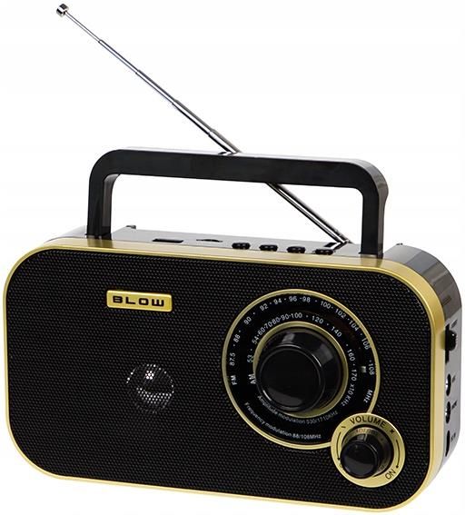 Radio przenośne analogowe AM/FM BLOW RADIO KUCHENNE RETRO RA12 ANALOGOWE PRZENOŚNE AM/FM Z BLUETOOTH USB SD AUX I GNIAZDEM SŁUCHAWKOWYM Wszechstronna łączność – muzyka z wielu źródeł Dzięki portowi USB i wejściu na karty SD, radio umożliwia odtwarzanie ulubionej muzyki bezpośrednio z nośników pamięci. Możesz też skorzystać z wejścia AUX 3,5 mm, by podłączyć telefon lub inne urządzenie mobilne. Posiada dodatkowo wejście słuchawkowe jack 3,5mm, dzięki któremu możemy podłączyć do urządzenia słuchawki. Wbudowana funkcja Bluetooth pozwala na bezprzewodowe parowanie z telefonem – koniec z kablami, pełna swoboda słuchania! Styl retro z nowoczesną funkcjonalnością Czarno-złoty design przyciąga wzrok i nadaje elegancji każdemu wnętrzu. Styl retro doskonale komponuje się z nowoczesną technologią, tworząc produkt, który jest zarówno funkcjonalny, jak i dekoracyjny. Duże pokrętło strojenia i analogowy wskaźnik pasma nadają urządzeniu klasyczny charakter, a jednocześnie zapewniają intuicyjną obsługę. Przenośność i wygoda użytkowania Zasilanie bateryjne (4 x AA R6), sieciowe lub z gniazda USB-C sprawia, że radio jest idealne do użytku w domu i na zewnątrz – na działce, pikniku czy w warsztacie. Wygodna rączka i kompaktowe wymiary (210 x 73 x 110 mm) czynią z niego praktyczne urządzenie mobilne, które możesz zabrać wszędzie. Czysty dźwięk i mocny odbiór Teleskopowa antena poprawia jakość sygnału FM i AM, zapewniając stabilny i czysty odbiór stacji radiowych. Mimo kompaktowych rozmiarów, dynamiczny głośnik 3,5” o mocy 0,8 W gwarantuje czyste brzmienie – idealne do słuchania radia, podcastów czy audiobooków. Prosta obsługa i niezawodność Analogowy tuner i duże pokrętła do zmiany głośności oraz strojenia pasma ułatwiają codzienną obsługę, nawet osobom starszym czy dzieciom. Marka BLOW to gwarancja solidnego wykonania i niezawodności w codziennym użytkowaniu – radio posłuży Ci przez lata. Specyfikacja AM/FM (AM 530–1600kHz, FM 87.5 – 108 MHz) Głośnik: 3,5 cale, 8 omów dynamiczny głośnik Moc wyjściowa: 0,8 W Gniazdo AUX: 3,5 mm Gniazdo słuchawkowe: Jack 3,5 mm Port kart pamięci SD Port USB Teleskopowa antena DC 3V (4 x AA R6) AC 230 V ~ 50 Hz (kabel w zestawie) Gniazdo USB-C Wymiary: 210 x 73 x 110 mm Kolor: czarno-złoty