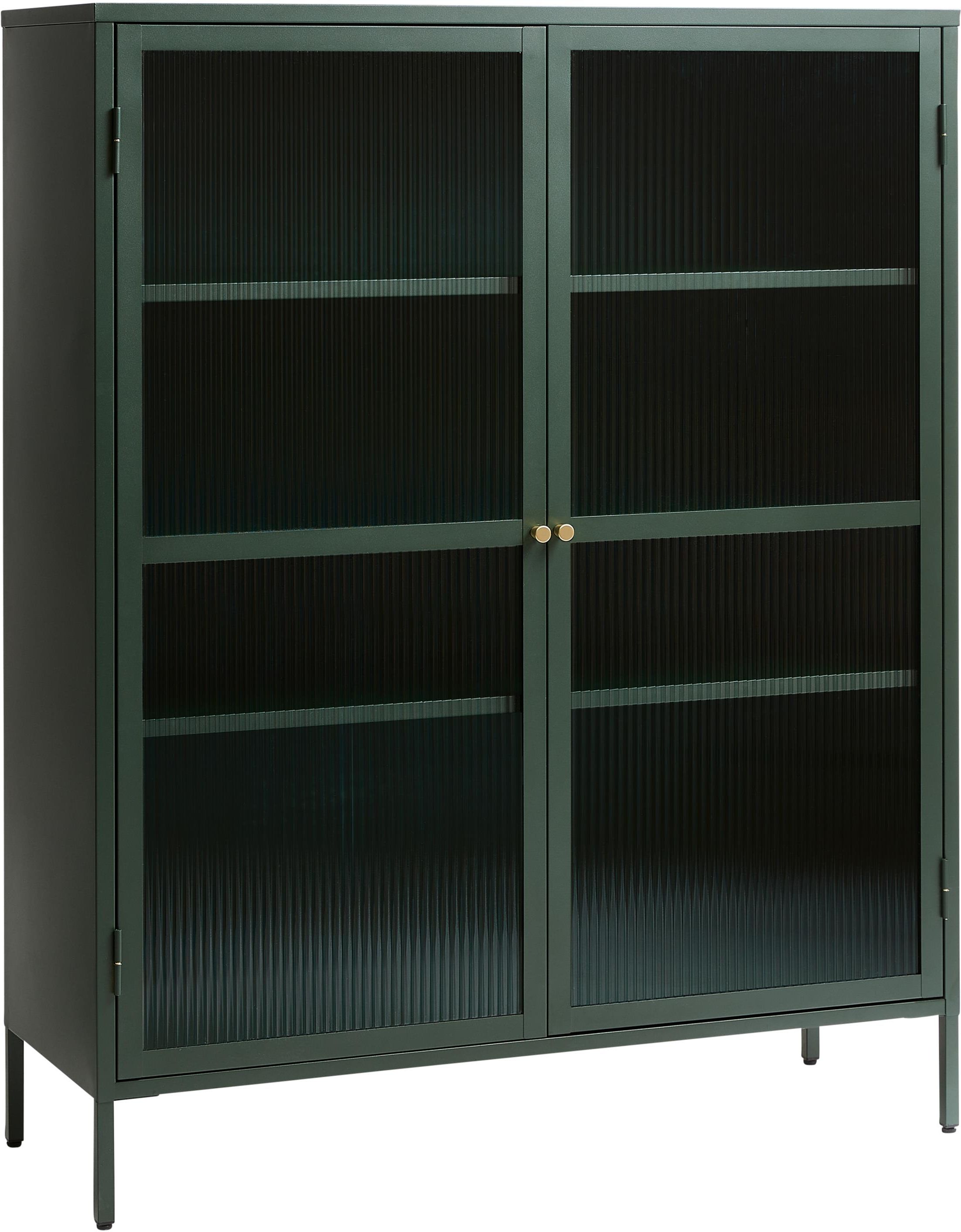 Witryna Bronco H140 cm zielona Witryna o wysokości 140 cm z trzema półkami z przeszkleniem wykonana z metalu w kolorze metalicznej czerni. Styl nowoczesny, industrialny. Wymiary Szerokość (cm): 110,9 Wysokość (cm): 140 Głębokość (cm): 40,3 Dane techniczne Kolor: Metaliczny zielony Materiał: metal, szkło Montaż: Do samodzielnego montażu Waga z opakowaniem(kg): 57 Waga(kg): 48,5 Liczba drzwi: 2 Objętość: 0,21993 Liczba półek: 3