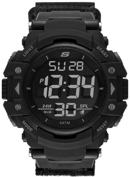 Skechers Zegarek Męski Keats Wytrzymały styl i wielofunkcyjność łączą się w zegarku cyfrowym Skechers Keats. Trwała obudowa z tworzywa ABS i pasek z nylonowej tkaniny w cyfrowym zegarku z chronografem w stylu nurkowym. Trwała, lekka obudowa z tworzywa ABS Tkany pasek z nylonu i ABS jest elastyczny dla wygody. Teksturowany pierścień w stylu nurka z metalowymi akcentami Wyświetlacz cyfrowy z funkcją stopera Cztery przyciski sterujące Timer, stoper, alarm i inne funkcje Rozmiar obudowy 45 mm Wodoodporność do 5 atmosfer