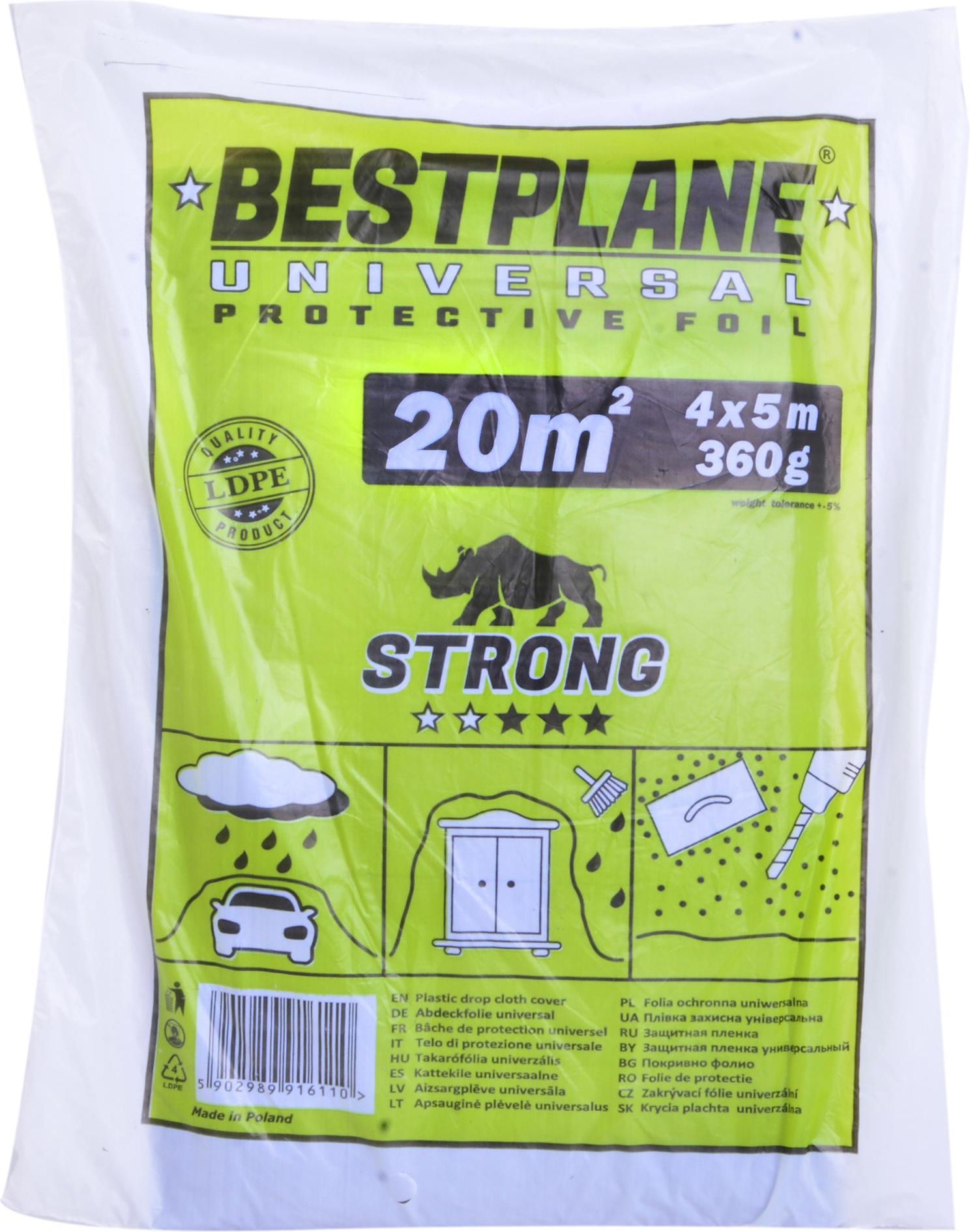 FOL-POZ FOLIA Malarska plandeka budowlana gruba 4X5M 20M2Folia budowlana skutecznie chroni przed zabrudzeniem, dlatego jest powszechnie stosowana w budownictwie. Używane są na wielu etapach, od zabezpieczania fundamentów przed wilgocią z gruntu do osłony miejsc przechowywania materiałów budowlanych. Znakomicie spełnia również swoją funkcje jeżeli chodzi o ochronę przed kurzem i zachlapaniem. Najlepszy wybór zarówno dla profesjonalisty, jak i dla indywidualnego użytkownika.Cechy charakterystyczne:Tańszy zamiennik papyChroni przed deszczem,wilgocią i wiatremWytrzymałaUniwersalnaElastycznaProsta w montażuGruba, wykonana z polietylenu niskiej gęstości (LDPE)Folia w kolorze czarnymZastosowanie: Skutecznie zabezpiecza miejsca pracy przed czynnikami zewnętrznymi oraz zanieczyszczeniami powstałymi w trakcie prac budowlanychPosiadają zwiększoną odporność na przetarcia i przerwaniaMoże stanowić warstwę zabezpieczającą przed wilgocią oraz infiltracją powietrzaProwizoryczne zabezpieczenie połaci dachowychZalecenia:ŚWIATŁO SŁONECZNE - produkty wykonane z polietylenu są szczególnie wrażliwe na promieniowanie UV, a tym samym muszą być one przechowywane - zwłaszcza latem - w obszarach, w których produkt jest chroniony przed bezpośrednim nasłonecznieniem. Wytrzymałość produktów wystawianych na promieniowanie słoneczne może czasie zacząć maleć, po dłuższym okresie materiał może ulec rozerwaniu. TRANSPORT - muszą być transportowane z zachowaniem należytej ostrożności.WILGOĆ - polietylen posiada bardzo niski poziom absorpcji wody, ale w celu uniknięcia powstania na folii zarodników mchu i pleśni należy przechowywać ją w suchym i chronionym od deszczu miejscu, gdzie średnia wilgotność powietrza jest poniżej 60%. W przypadku folii nawijanej na papierowe gilzy: mokry lub przesiąknięty rdzeń może się załamać, w wyniku czego trudno będzie odwinąć folię przeznaczoną do użytku.Parametry: Szerokość: 4mDługość: 5mTolerancja wagi: 360g +/- 10%Kod produktu: PL400X500_360G