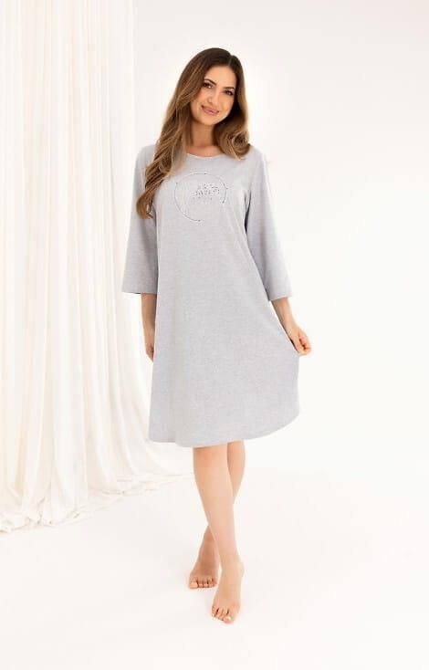 Koszula nocna damska 167 J/25 – kobieca forma i naturalna wygoda Koszula nocna 167 J/25 to idealne połączenie klasycznego fasonu i subtelnego uroku. Wykonana w 100% z wysokiej jakości bawełny, gwarantuje komfort noszenia oraz przewiewność przez całą noc. Model posiada rękaw 3/4 i półokrągły dekolt, a przód ozdobiony został delikatnym nadrukiem. Lekko rozkloszowany krój ku dołowi pięknie układa się na sylwetce, zapewniając swobodę ruchów. Długość przed kolano sprawia, że koszula jest praktyczna zarówno na cieplejsze, jak i chłodniejsze noce.