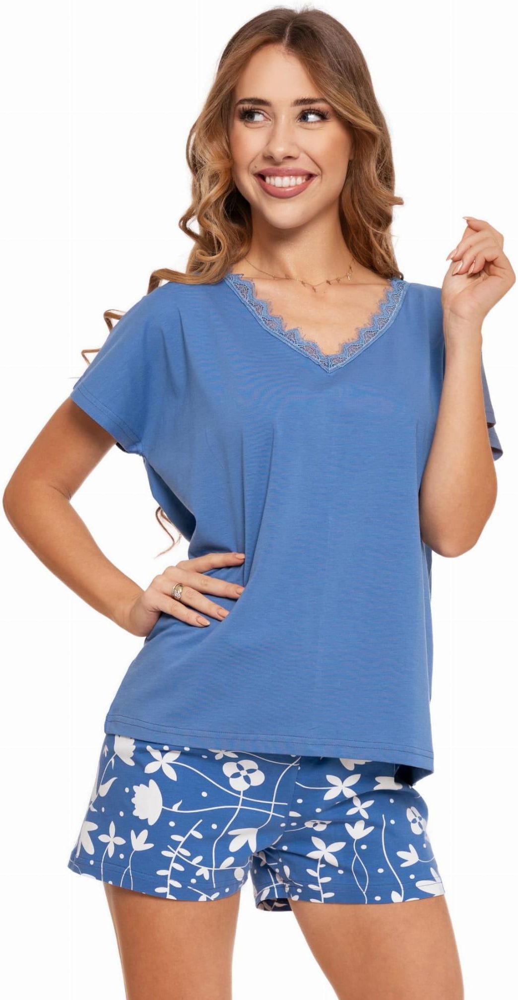 Piżama damska z krótkim rękawem i krótkimi spodenkami. Koszulka w granatowym kolorze, dekolt w kształcie litery V, ozdobiony koronką. Spodenki krótkie w kwiatowe wzory. W pasie wygodna gumka. Skład: 95 % bawełna 5 % elastan ROZMIAR : S WZROST 158 KLATKA PIERSIOWA 88 BIODRA 92 M WZROST 164 KLATKA PIERSIOWA 94 BIODRA 100 L WZROST 170 KLATKA PIERSIOWA 100 BIODRA 106 XL WZROST 176 KLATKA PIERSIOWA 106 BIODRA 112