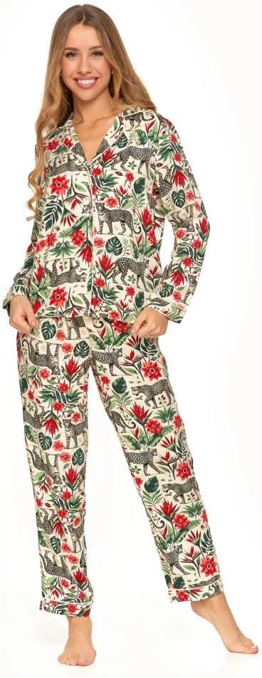 Piżama damska Moraj o luźnym kroju wykonana z miękkiej i przewiewnej wiskoz idealnej na lato. Góra piżamy rozpinana na całej długości, dekolt z kołnierzykiem obszytym kontrastową lamówką w kolorze kremowym, rękaw długi. Spodnie długie, w pasie elastyczna gumka oraz troczek do regulacji. Całość piżamy wzorowana w egzotyczny zwierzęco-roślinny wzór. Skład: 100% wiskoza