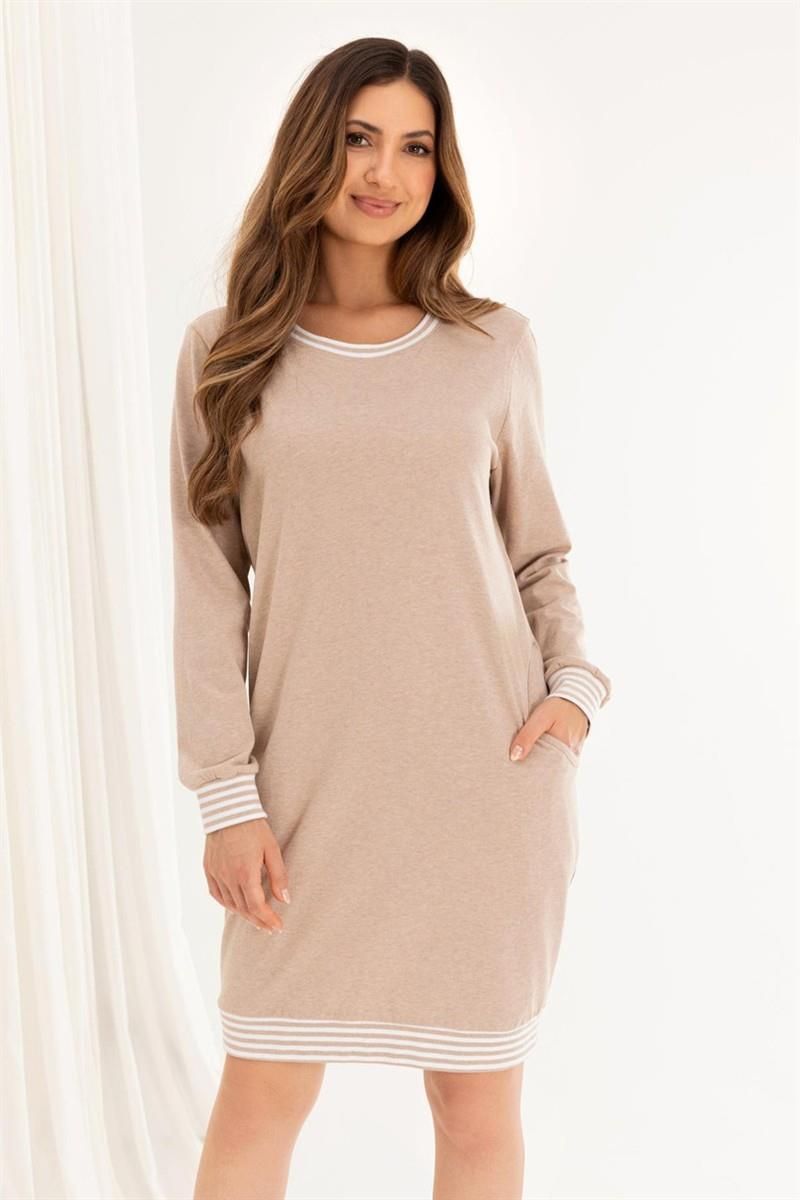 Koszula damska 159 J/25 to sportowy model stworzony z myślą o wygodzie i swobodzie. Wykonana w 100% z miękkiej, oddychającej bawełny, zapewnia komfort podczas wieczornego relaksu i nocnego wypoczynku. Koszulka posiada długi rękaw oraz praktyczne kieszenie, co czyni ją idealną nie tylko do spania, ale także jako domowa odzież na leniwe poranki lub wieczory. Prosty, sportowy krój i szeroka rozmiarówka (M–XXL) sprawiają, że każda kobieta poczuje się w niej swobodnie i naturalnie.
