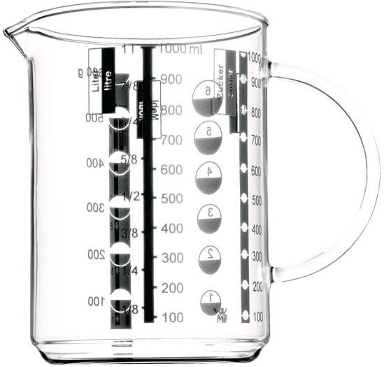 WMF – Gourmet pojemnik z miarką 1,0 l Szklany pojemnik z miarką WMF Gourmet o pojemności 1 litra to nieodzowne narzędzie w kuchni, które łączy funkcjonalność z niezawodną jakością marki WMF. Został zaprojektowany z myślą o maksymalnej precyzji i wygodzie podczas gotowania i pieczenia – niezależnie od poziomu zaawansowania kulinarnego użytkownika. Wyposażony w czytelne, wtopione podziałki w czterech jednostkach miary – litrach, mililitrach, filiżankach i gramach – umożliwia precyzyjne odmierzanie zarówno płynnych, jak i sypkich składników. Dzięki temu z łatwością przygotujesz zupy, sosy, koktajle, ciasta i wiele innych potraw bez potrzeby stosowania dodatkowych miarek. Wysokiej jakości żaroodporne szkło wytrzymuje temperaturę do 100°C, dzięki czemu naczynie nadaje się zarówno do użycia w kuchence mikrofalowej, jak i do mycia w zmywarce. Ergonomiczny uchwyt i dzióbek zapobiegający kapaniu zapewniają wygodę użytkowania i czystość na blacie kuchennym. Najważniejsze cechy: Pojemność: 1,0 litra – idealna do większych ilości składników Precyzyjne podziałki: litry, mililitry, filiżanki, gramy Odporne na temperaturę do 100°C – idealne do mikrofalówki Można myć w zmywarce – łatwe utrzymanie czystości Dzióbek zapobiegający kapaniu – czyste i bezpieczne dozowanie Wygodny uchwyt – komfortowy chwyt podczas nalewania Pojemnik z miarką WMF Gourmet 1,0 l to praktyczne, trwałe i stylowe rozwiązanie, które ułatwia codzienne przygotowywanie posiłków. Uniwersalność jednostek pomiarowych sprawia, że sprawdzi się zarówno w polskich, jak i międzynarodowych przepisach. Dzięki eleganckiemu designowi i wytrzymałym materiałom jest to narzędzie, które sprosta wymaganiom domowych kucharzy i profesjonalistów. Postaw na niemiecką jakość marki WMF i wprowadź do swojej kuchni nowy poziom precyzji i wygody. WMF jest marką LUKSUSOWĄ. Firma od 1853 roku specjalizuje się w produkcji wysokiej jakości sztućców, galanterii stołowej, artykułów kuchennych dla gospodarstwa domowego jak i profesjonalnej gastronomii. Marka WMF jest jednym ze światowych liderów produkujących wyposażenie dla Hoteli, restauracji i kawiarni.