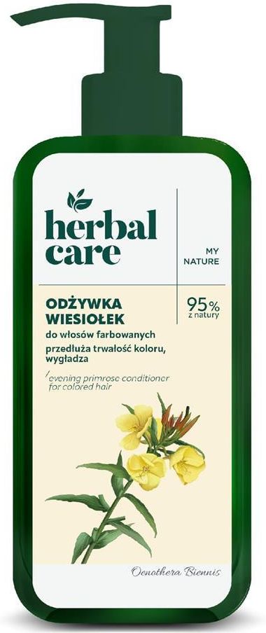 Herbal Care Odżywka do włosów farbowanych Wiesiołek 200 ml | Ochrona koloru i regeneracja Herbal Care Odżywka do włosów farbowanych Wiesiołek, 200 ml Odżywka Herbal Care z ekstraktem i olejem z wiesiołka została stworzona z myślą o potrzebach włosów farbowanych, osłabionych zabiegami koloryzacji. Jej bogata formuła intensywnie regeneruje, wygładza strukturę włosów i chroni ich kolor przed blaknięciem. Pozostawia pasma miękkie, lśniące i pełne życia, bez efektu obciążenia. 🌿 Korzyści ze stosowania 🌈 ochrona koloru włosów farbowanych przed wypłukiwaniem 💧 głębokie nawilżenie i regeneracja osłabionych pasm ✨ włosy wygładzone, miękkie i łatwe do ułożenia 🪶 lekka formuła – bez efektu obciążenia 🧴 Sposób użycia 🧼 Nanieś niewielką ilość odżywki na umyte, wilgotne włosy. ⏱️ Pozostaw na 5 minut, aby składniki aktywne zadziałały. 🚿 Dokładnie spłucz letnią wodą. Ostrzeżenia i środki ostrożności 🚫 Tylko do użytku zewnętrznego. 👁️ Unikaj kontaktu z oczami. W przypadku dostania się do oczu – natychmiast przepłucz wodą. 🧒 Przechowywać w miejscu niedostępnym dla dzieci. 🧪 Składniki aktywne 🌼 Olej z wiesiołka – regeneruje i wzmacnia włosy 🌿 Ekstrakt z wiesiołka – chroni przed blaknięciem koloru 💧 HYDRAFEEL 3 – intensywnie nawilża i wygładza 🌾 Inulina – naturalny prebiotyk wspierający mikrobiom skóry głowy 💦 Gliceryna – zapewnia miękkość i elastyczność pasm 📋 Skład INCI Aqua (Water), Cetearyl Alcohol, Distearoylethyl Dimonium Chloride, Dimethicone, Glycerin, Oenothera Biennis (Evening Primrose) Oil, Polyglyceryl-3 PCA, Inulin, Oenothera Biennis (Primrose Evening) Seed Extract, Octenidine HCl, Cetrimonium Chloride, Hydroxyethylcellulose, Citric Acid, Disodium EDTA, Phenoxyethanol, Ethylhexylglycerin, Parfum (Fragrance).
