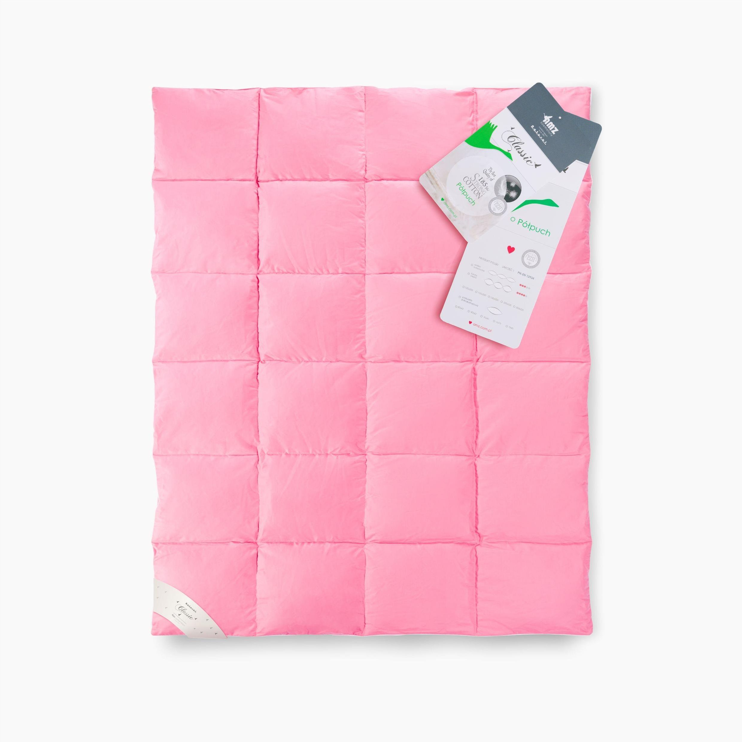 AMZ PÓŁPUCH kołdra zimowa 135x200cm Różowy Poczuj luksus w swoim łóżku! Nasza kołdra zapewnia idealną równowagę między ciepłem a przewiewnością, dzięki czemu śpisz lepiej i budzisz się wypoczęty. Zawsze Świeże i Prosto z Produkcji – Czas Dostawy dla Twojego Komfortu Czas dostawy wynoszący 7 dni to nie wada, a przemyślana korzyść, stworzona z myślą o Tobie. Dzięki temu nasze produkty są zawsze świeże, ponieważ nie magazynujemy ich przez długie miesiące. Każdy produkt, który do Ciebie trafia, jest wyprodukowany na zamówienie, co oznacza, że masz pewność najwyższej jakości i świeżości, której nie znajdziesz w magazynowanych towarach przez inne sklepy tygodniami czy nawet miesiącami. Zimowa kołdra produkowana metodami tradycyjnymi. Wypełniona półpuchem gęsim 20% oraz miękkimi, drobnymi piórkami puchowymi. Pokryta mocnym inletem bawełnianym. Jest to polski produkt, uszyty z dbałością o najmniejszy detal. Wyrób naturalny, zbudowany z jakościowych surowców, które zapewniają odpowiednią cyrkulację powietrza oraz optymalny poziom wilgotności. Marzniesz zimą, a latem się przegrzewasz? Nasza kołdra dba o idealną temperaturę przez cały rok. Materiały Pokrycie: mocny inlet bawełniany o gramaturze 185g/m2 Wypełnienie: naturalne — puch gęsi 20% oraz 80% miękkich, drobnych piórek Budowa:Kołdra o budowie tradycyjnej – szyta w technologii zimnego szwu, sprawdzoną metodą szycia. Pikowania na całej powierzchni uniemożliwiają przemieszczanie się wypełnienia między komorami. Wykończona bizą, która poza walorami estetycznymi dodatkowo uszczelnia kołdrę. Produkt posiada atest PZH wydany przez Narodowy Instytut Zdrowia Publicznego. Utrzymanie:Kołdry nie należy: prać, prasować, bielić, ani chlorować. W razie konieczności suszyć w stanie rozwieszonym. Produkt z atestem PZH wydanym przez Narodowy Instytutu Zdrowia Publicznego.Opakowanie fabryczne produktu służy do jego bezpiecznego przechowywania oraz transportu. Wyobraź sobie, jak otulasz się miękką, puszystą kołdrą po długim dniu – to przytulne ciepło, którego nie opuścisz. Cechy produktu Kolor: Różowy Wymiary: 135x200cm Szerokość: 135 Długość: 200 Sezonowość kołdry: zimowa Wypełnienie: Pierze Zaleta: tradycyjna metoda produkcji Gramatura: 135x200 - 1800g; 155x200 - 1900g; 200x220 - 2700g; Temperatura: Ciepła Typ kołdry: Natural Możliwość prania: nie Przyjazny alergikom: nie Tkanina pokryciowa 1: inlet bawełniany 185g/m2 Typ szycia: szycie tradycyjne - zimny szew Wypełnienie 1: półpuch Kraj pochodzenia: Polska Nasze kołdry wyróżniają się wypełnieniem, które jest wyjątkowo trwałe – stworzone z myślą o Twoim zdrowiu i komforcie. Dłuższy czas dostawy pozwala nam dostarczać produkty bez nieprzyjemnych zapachów czy oznak wilgoci, które mogą wystąpić przy długo składowanych towarach. Nasze produkty trafiają do Ciebie prosto z linii produkcyjnej – tuż po ich wytworzeniu. Dzięki temu masz pewność, że dostajesz coś, co zostało stworzone specjalnie dla Ciebie, a nie leżało w magazynie. Wybierając nasze produkty, inwestujesz w najwyższą jakość i świeżość, które są gwarantowane przez naszą filozofię dostaw. To rozwiązanie, które sprawia, że możesz cieszyć się produktami dopracowanymi w każdym szczególe, idealnie dostosowanymi do Twoich potrzeb. Nie czekaj, by podarować sobie luksusowy sen – wybierz naszą kołdrę i poczuj różnicę już od pierwszej nocy!