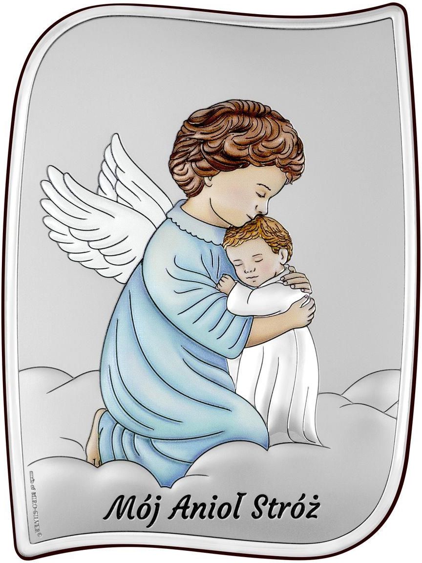 Niezwykły obrazek Anioł Stróż o ciekawym kształcie z napisem w języku polskim . Obrazek posrebrzany, warstwa srebra nakładana jest metodą dyfuzyjną na całej powierzchni obrazka. Zewnętrzna warstwa srebra zabezpieczona jest specjalnym lakierem ochronnym, dzięki któremu na długi okres czasu zachowa ona swój blask. Obrazek do postawienia. Wspaniały prezent na wiele okazji: chrzest, komunia, urodziny.